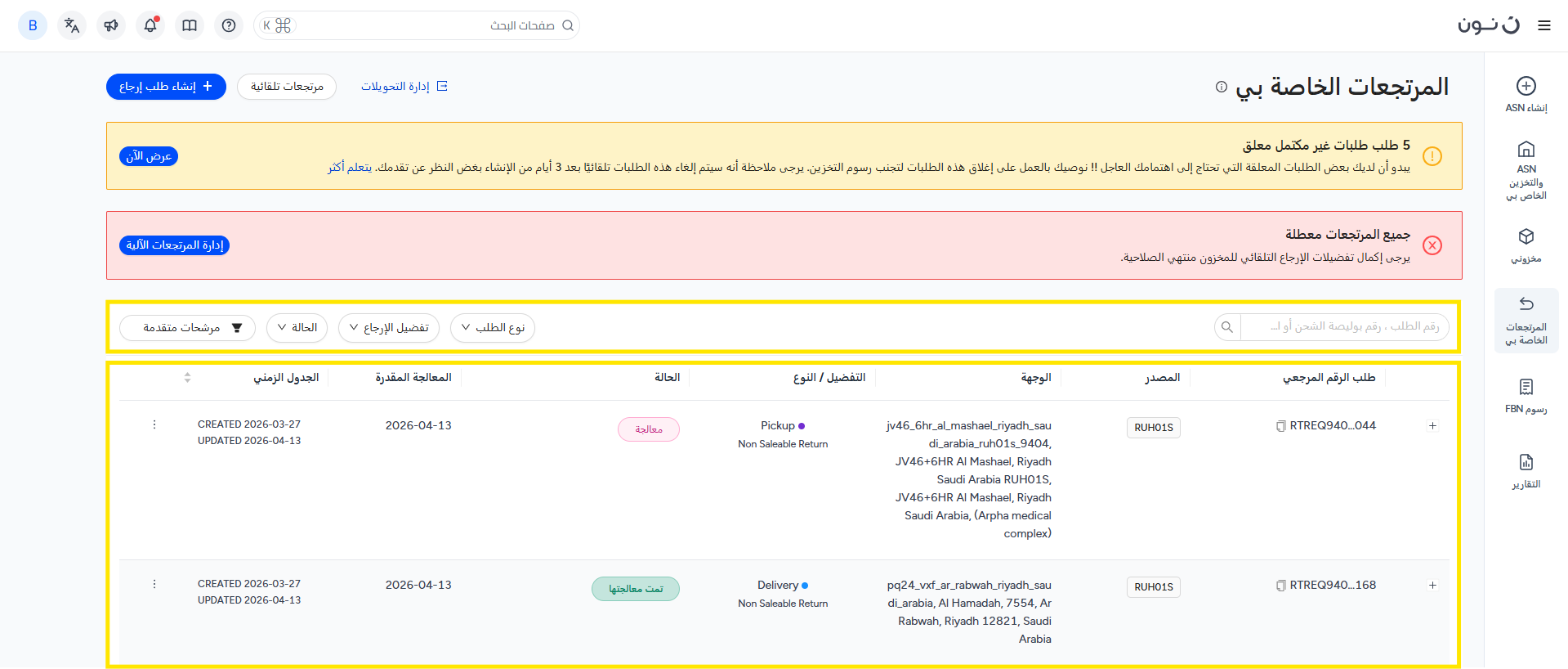 ملاحظة مهمة لبائعي الشحن المباشرإذا كنت من بائعي الشحن المباشر، فإن المرتجعات غير المُسلّمة (NDRs) يتم إعادتها تلقائيًا إلى عنوانك المسجل.