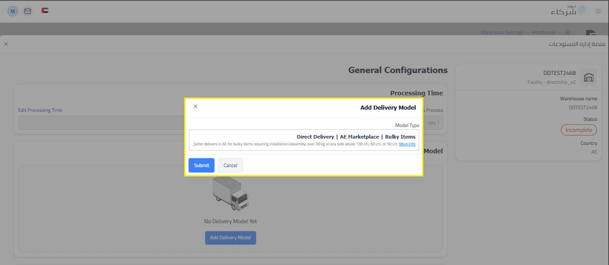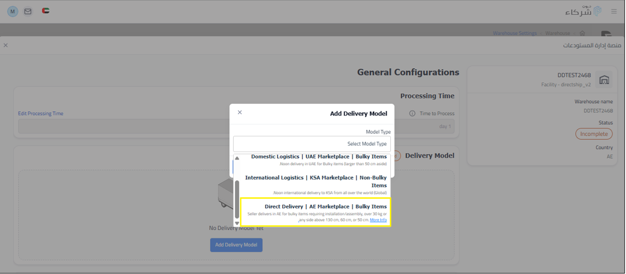 - في النافذة المنبثقة التي تظهر، حدد نوع النموذج: التوصيل المباشر للمنتجات الضخمة | سوق AE | عنصر ضخم.