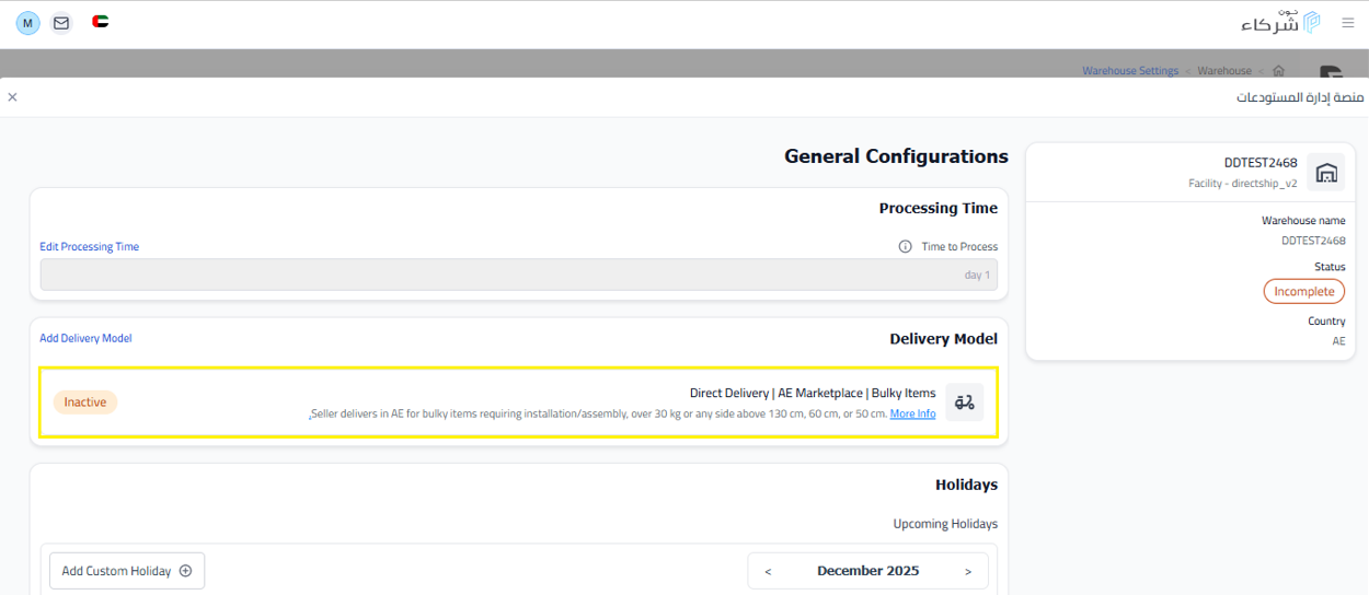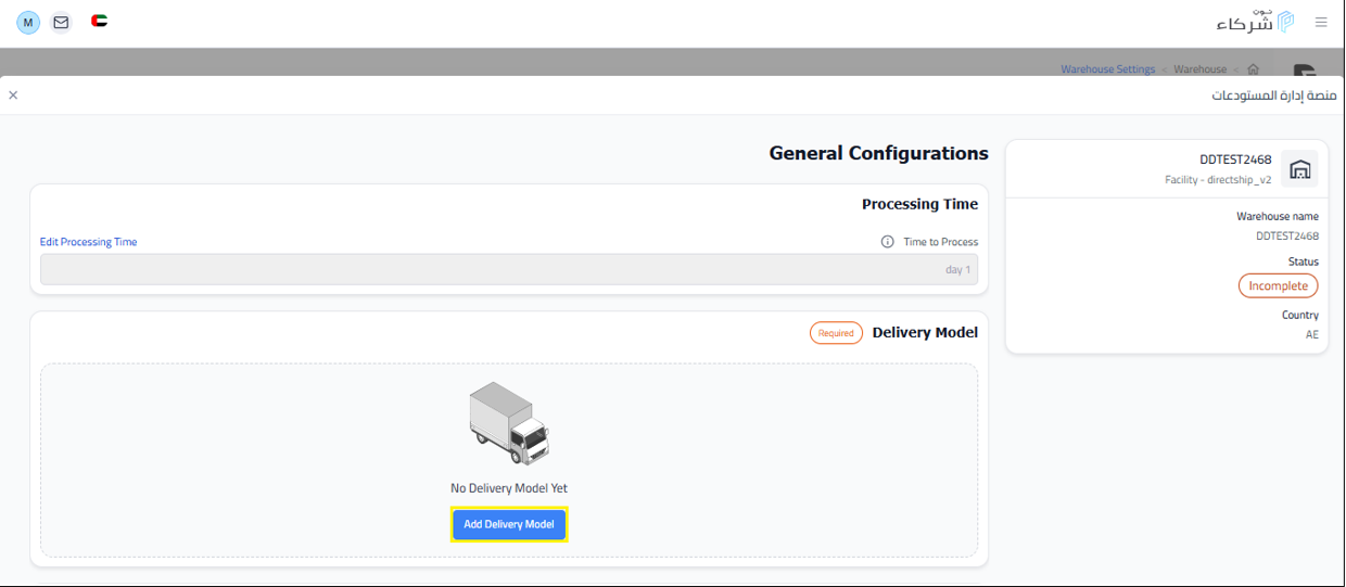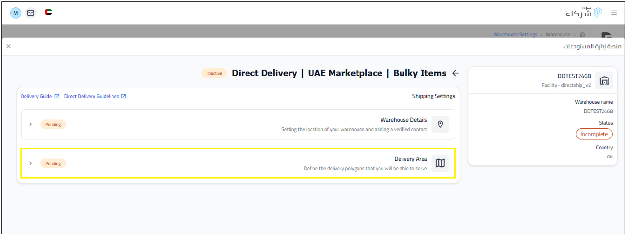 في حال حفظ الإعداد دون تحديد منطقة تسليم، ستظهر رسالة تُشير إلى حفظ منطقة تسليم فارغة. سيؤدي هذا إلى إلغاء تفعيل نموذج التوصيل المباشر للمستودع الحالي. لذا، يُرجى التأكد من تحديد منطقة تسليم قبل حفظ الإعدادات.