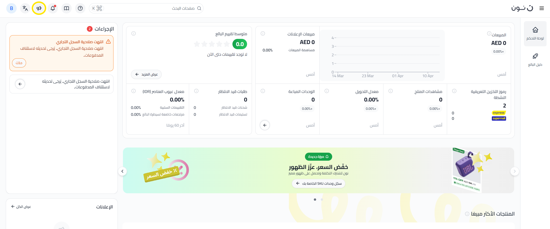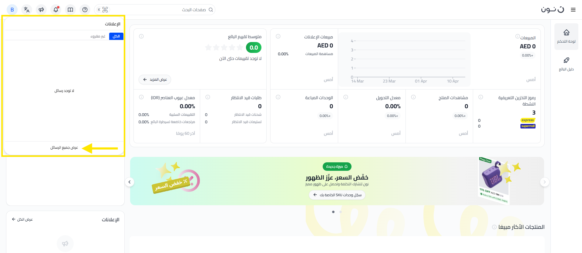 لمساعدة البائعين على إدارة اتصالاتهم بكفاءة أكبر، أُضيفت تم تقديم ميزة جديدة في موقع البائعين. من خلال هذا التحديث، يمكن للبائعين الآن الاطلاع على رسائلهم الإلكترونية الرسمية مباشرةً داخل موقع البائعين. سيساعدنا هذا على ضمان حصولك على جميع التحديثات من وقت لآخر بشكل أوضح.