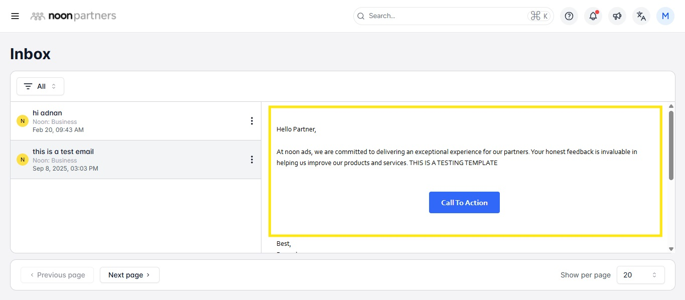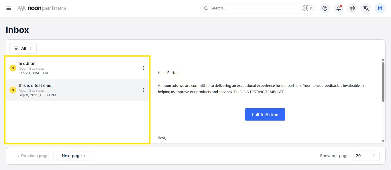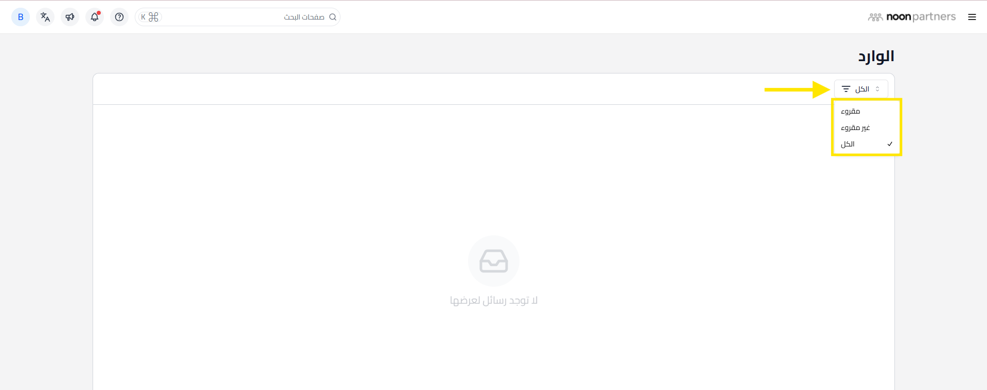 البريد الوارد الافتراضي على منصة شركاء نون