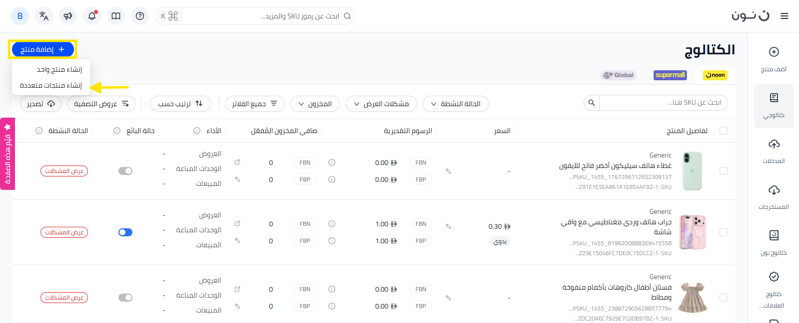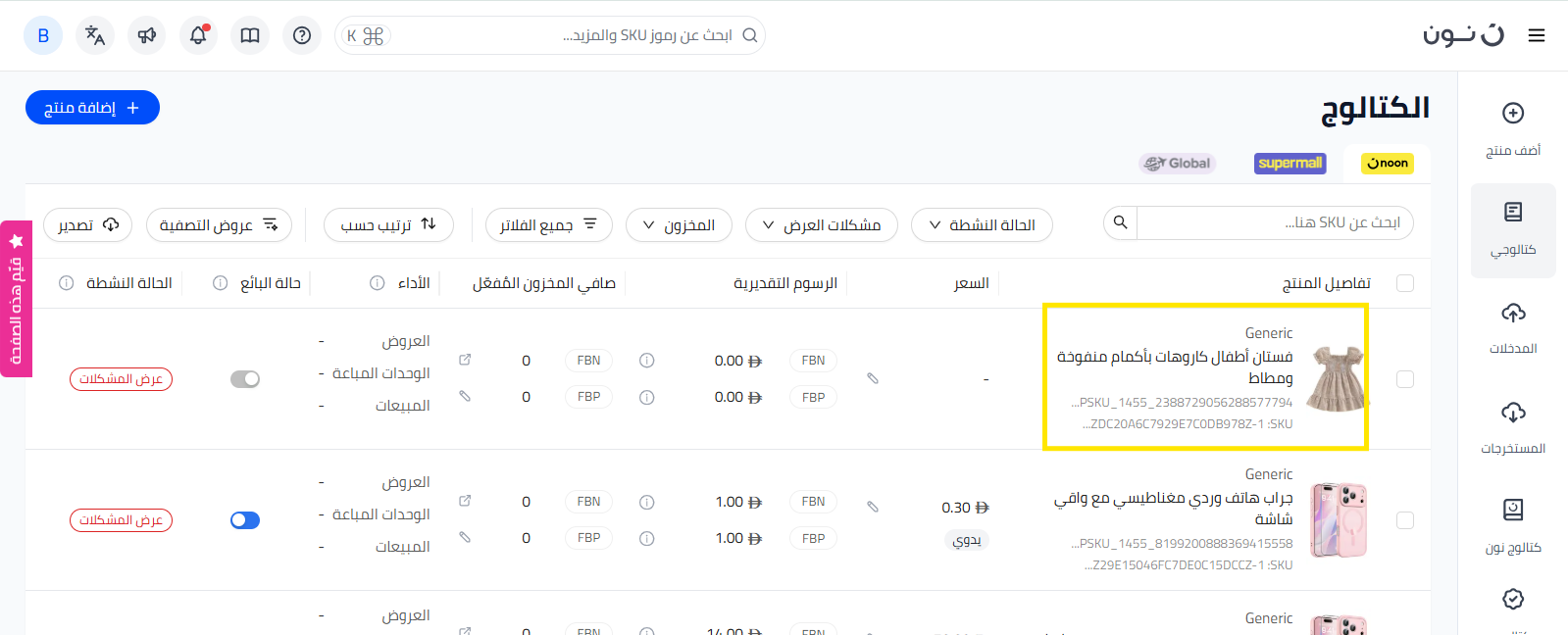 لتحديث معدلات ضريبة القيمة المضافة (VAT) لمنتجات فردية، قم بتسجيل الدخول إلى منصة شركاء نون وانتقل إلى كتالوج الشريك . ثم انقر على رمز PSKU الخاص بالمنتج الذي ترغب في تحديث معدل ضريبة القيمة المضافة له.