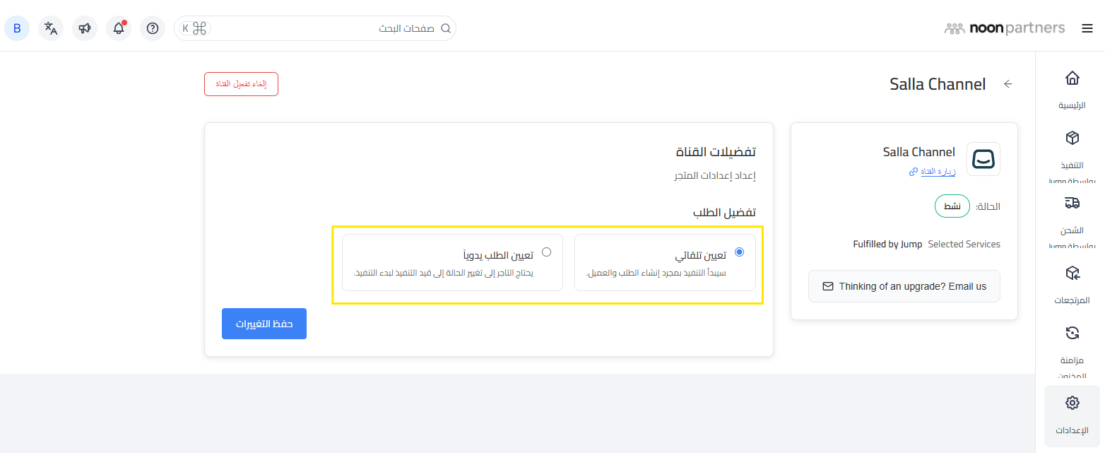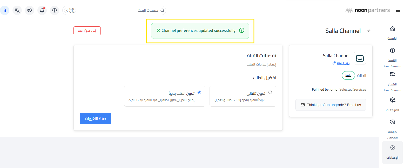 -هنا ستجد خيار زيارة القناة على منصة سلة. كما ستجد خيارًا آخر لإلغاء تفعيل القناة. يتيح لك هذا القسم أيضًا تحديد تفضيلات طلبك. بعد تحديد تفضيلاتك، يمكنك النقر على حفظ التغييرات لتحديثها.