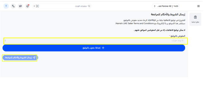 - سيتم توجيهك إلى قسم الموقّع المعتمد لتحديد الشخص الذي سيوقع العقد. اختر من القائمة المنسدلة وانقر على زر إرسال الشروط والأحكام للمراجعة. ستتلقى بريدًا إلكترونيًا مرتبطًا بالموقّع، ويجب عليك توقيع العقد للموافقة على الشروط والأحكام.