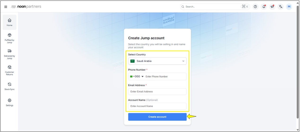 - سيُطلب منك تقديم بعض التفاصيل مثل الدولة ، رقم الهاتف، البريد الإلكتروني واسم المتجر. بعد ذلك، انقر على زر إنشاء حساب لإنشاء متجر JUMP الخاص بك.