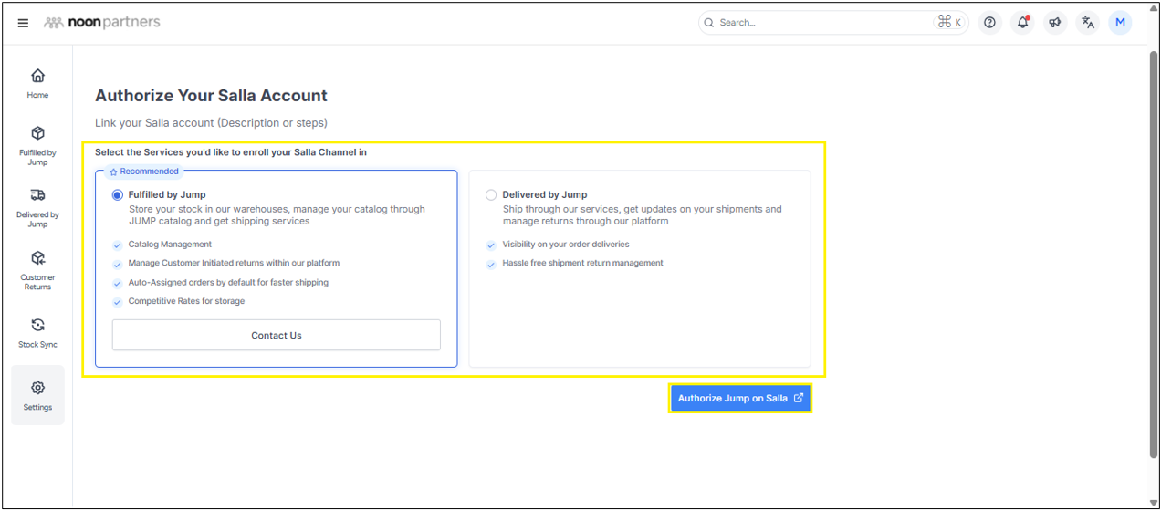 -اختر الخدمة التي ترغب في العمل معها، ثم اضغط على "Authorize Jump on Salla".