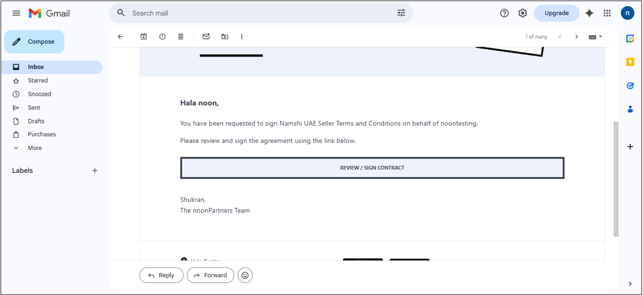 - ستتلقى بريدًا إلكترونيًا يتضمن الشروط والأحكام. انقر على مراجعة/توقيع العقد.