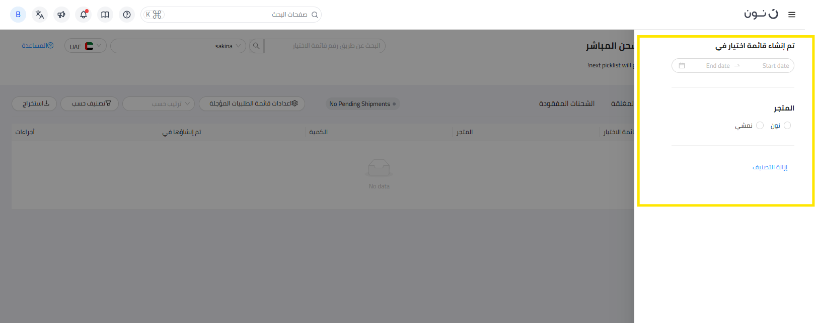 تصفية البيانات حسب النطاق الزمني وحالة الشحن/الطلب.