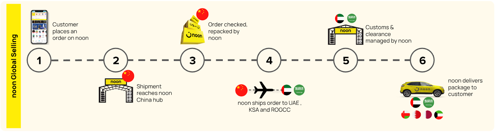 مع نموذج الشحن العالمي من نون (NGS)، يستطيع البائعون المقيمون في الصين الوصول مباشرةً إلى العملاء في الشرق الأوسط (الإمارات العربية المتحدة، والمملكة العربية السعودية، والبحرين، وقطر، والكويت، وسلطنة عمان) دون الحاجة إلى تأسيس أعمالهم محلياً (أي دون الحاجة إلى رخصة تجارية أو ضريبة القيمة المضافة في الإمارات العربية المتحدة أو المملكة العربية السعودية).