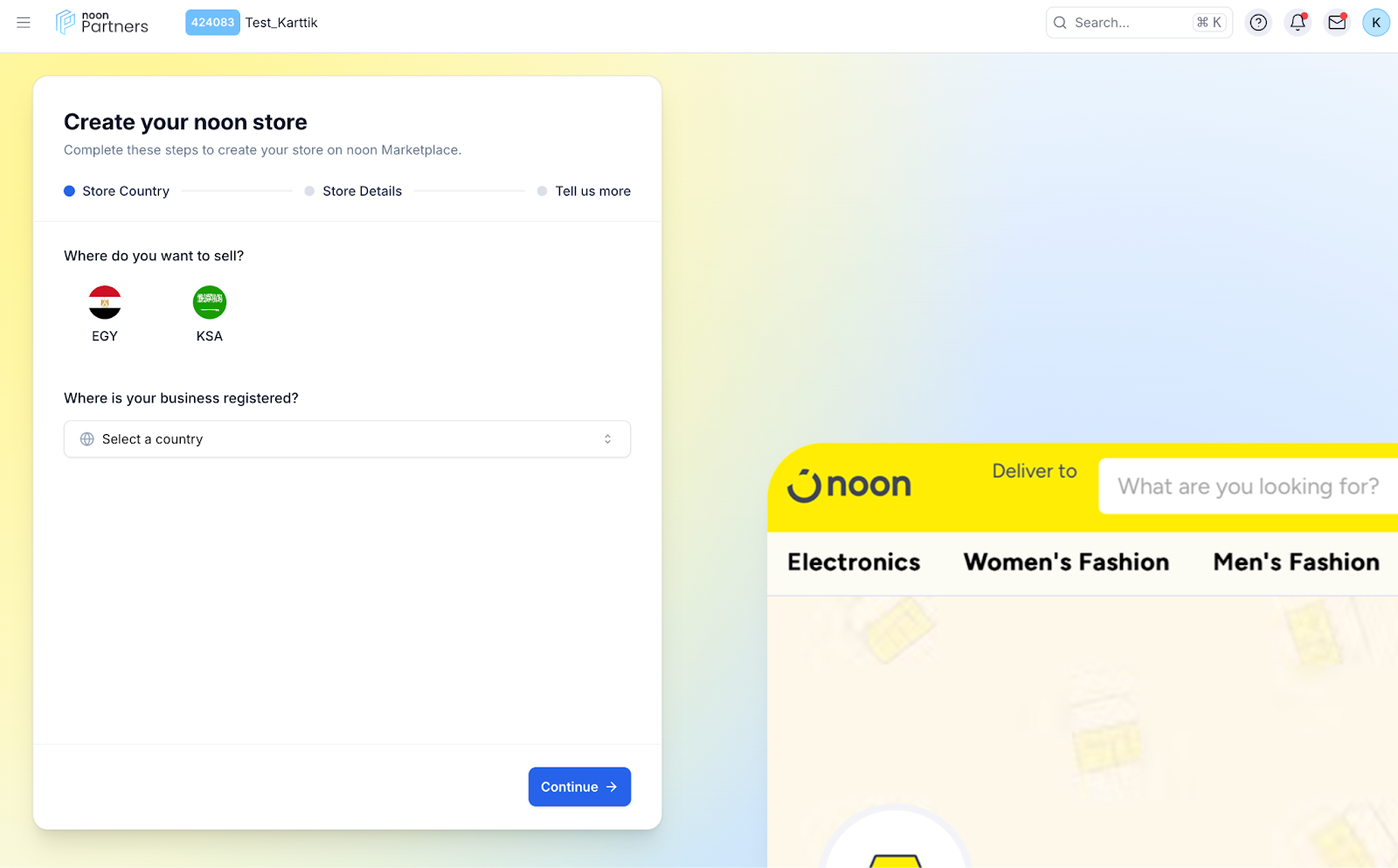 ب. اختر البلد الذي ترغب في عرض منتجاتك فيه (الإمارات أو المملكة العربية السعودية) والبلد الذي تم تسجيل نشاطك التجاري فيه.