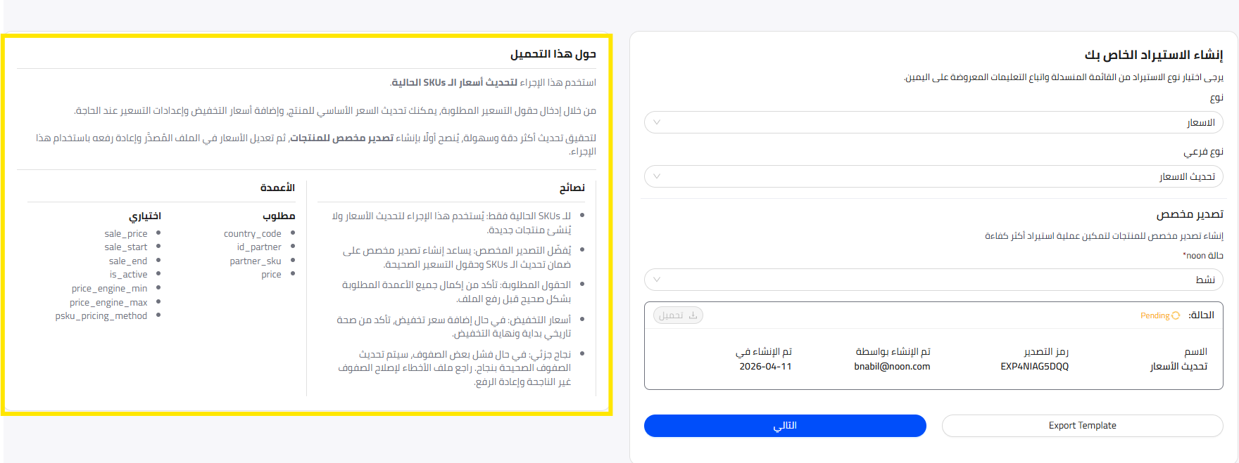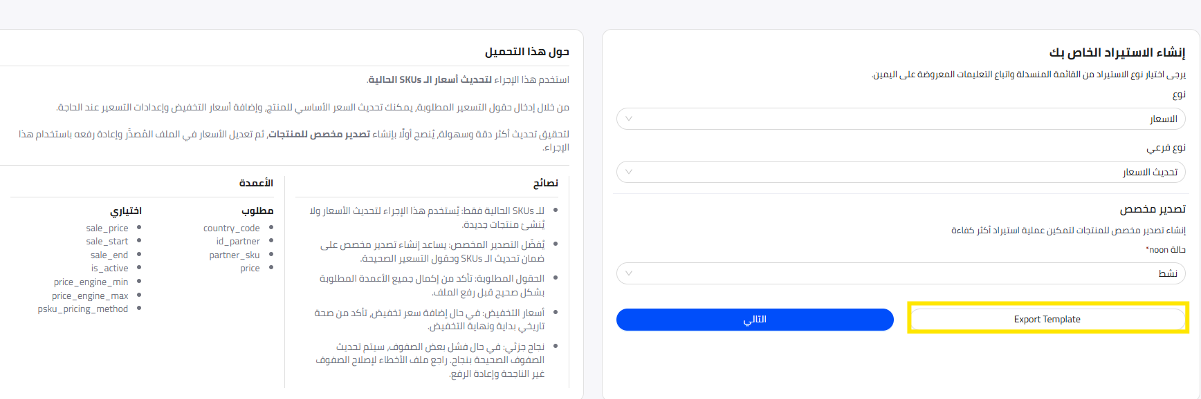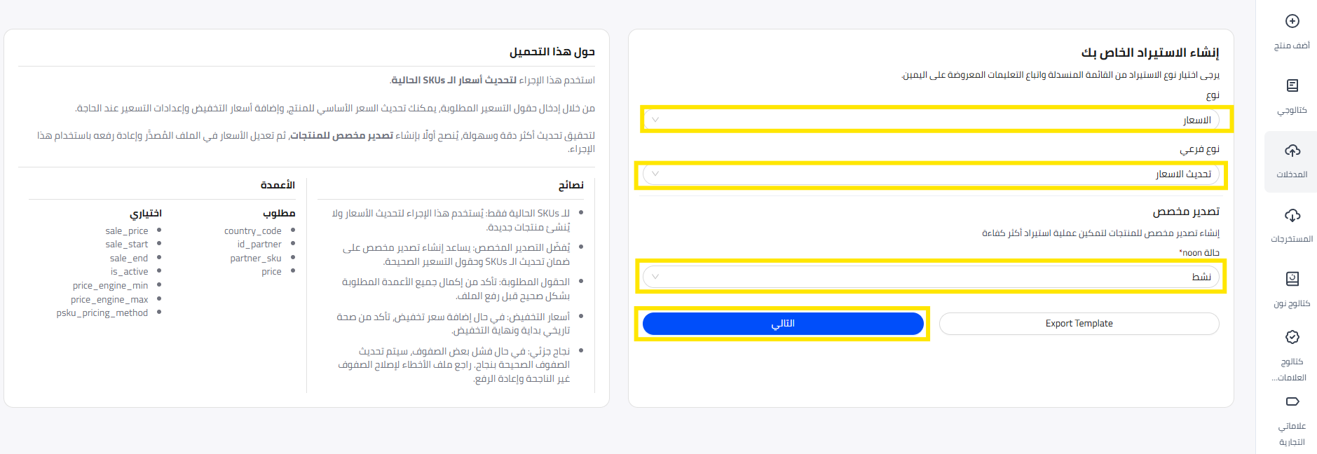 يتيح لك هذا الاستيراد تحديث السعر، سعر التخفيض، تاريخ بدء التخفيض وتاريخ نهاية التخفيض لمنتجاتك على موقع نون .