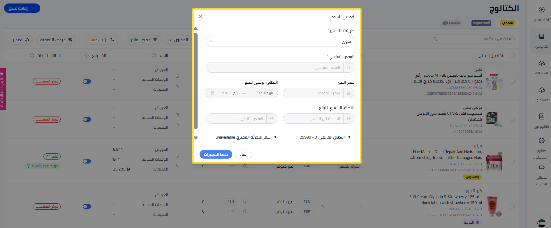 - اختر طريقة التسعير وقم بتحديث السعر للـ SKU. أي تغييرات يتم إجراؤها على العرض ستظهر فورًا على موقع noon. إذا كنت ترغب في إضافة سعر البيع، يمكنك أيضًا إضافته في الصفحة مع تحديد تواريخ البداية والنهاية للمدة التي تريد أن يكون فيها السعر المخفض فعالًا. إذا تم إضافة سعر البيع المخفض، فسيكون له الأولوية على السعر الأساسي خلال فترة الحملة. اضغط على حفظ التغييرات لتحديث السعر.