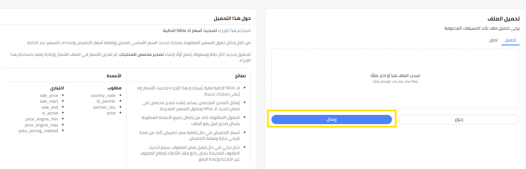 بعد معالجة التحديث، قم باستيراد نفس المنتج مرة أخرى بالتغيير المتبقي في السعر.