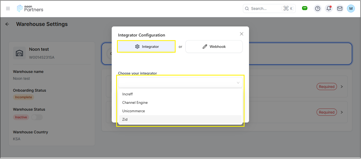 -ستظهر نافذة منبثقة تعرض خيارين: المُدمج والويب هوك. باختيار خيار المُدمج، يمكنك اختيار مُدمج من القائمة المنسدلة المُشتركة مع نون.