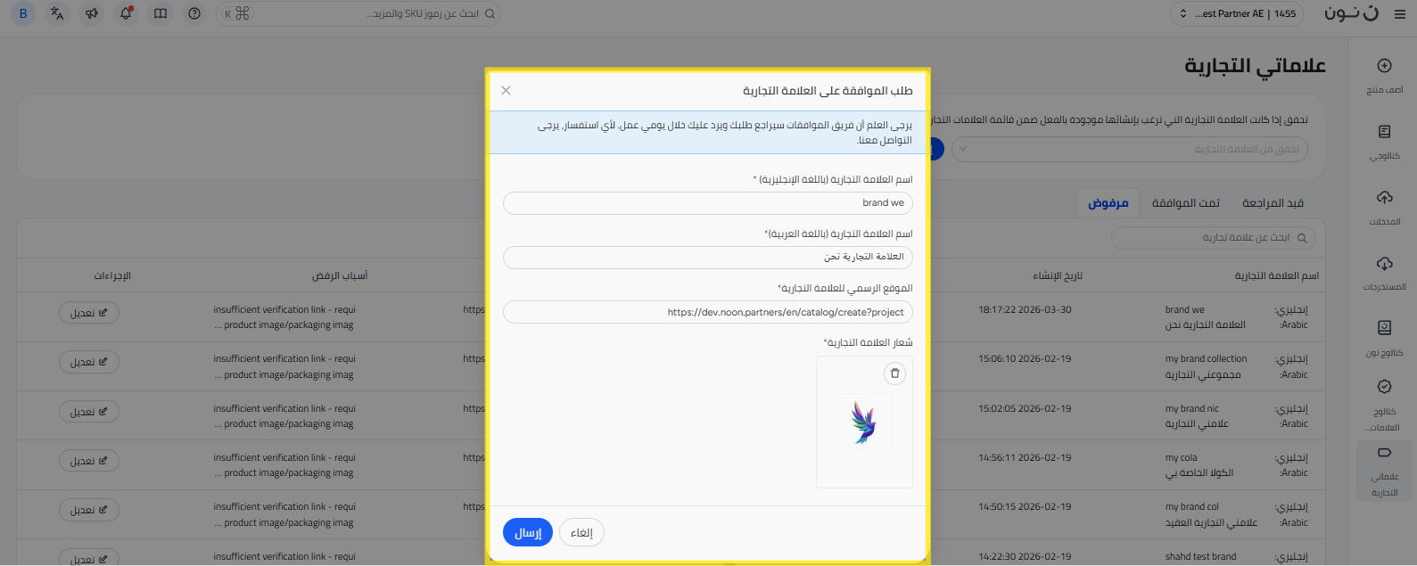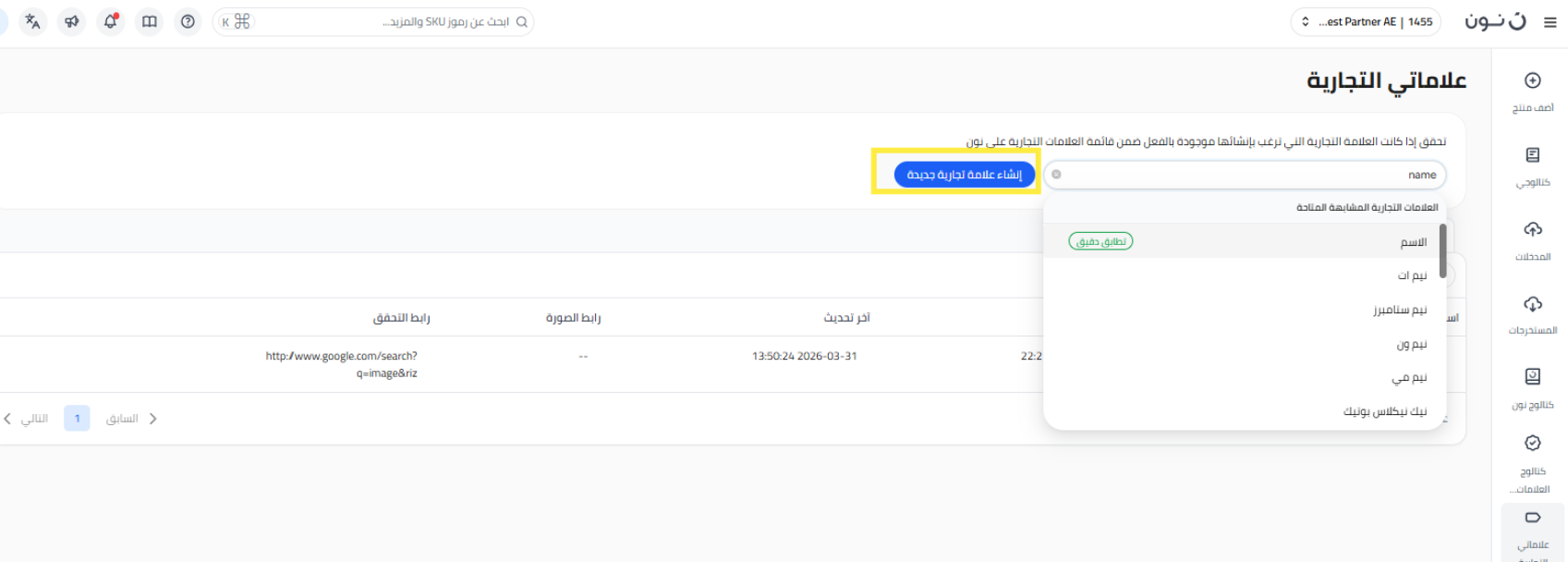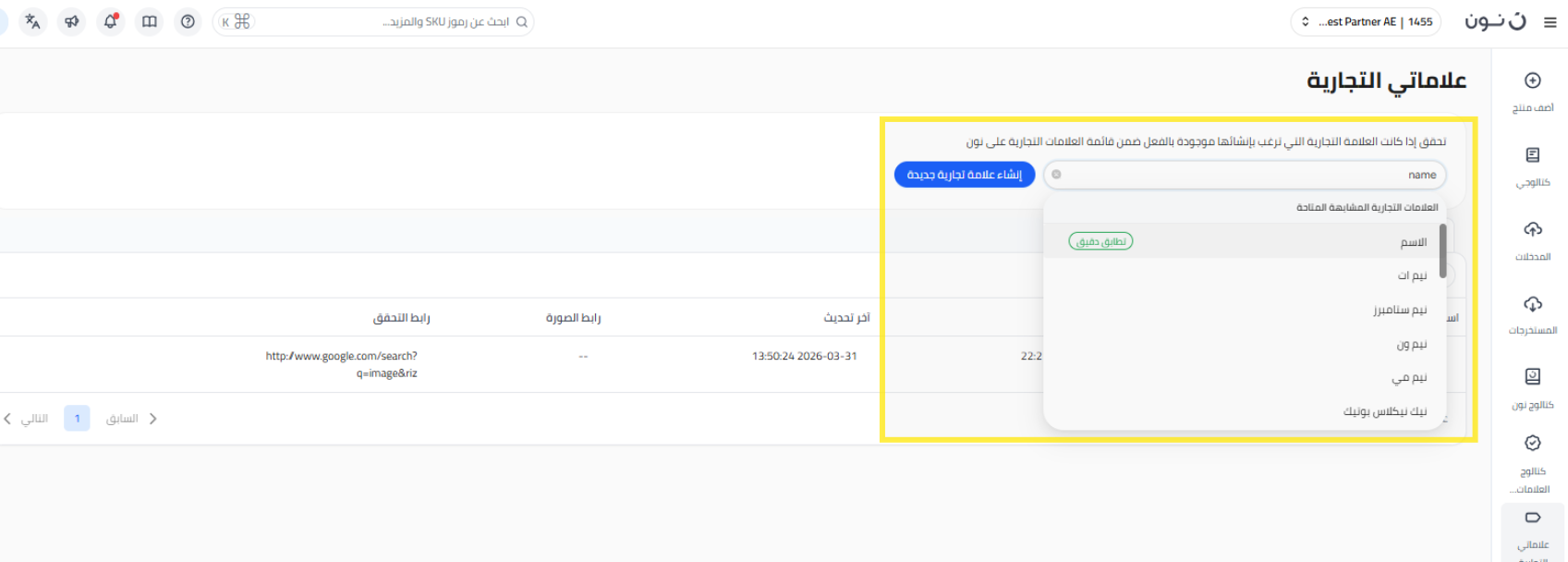 يمكنك فقط إدراج المنتجات الموجودة في قائمة العلامات التجارية التي تم التحقق منها. الآن لديك خيار طلب تسجيل علامة تجارية جديدة ليتم التحقق منها وإضافتها إلى القائمة من خلال عملية بسيطة في منصة شركاء نون.