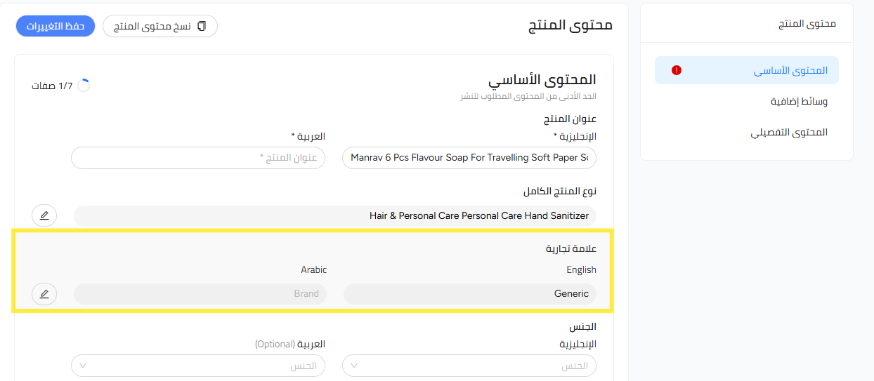 بمجرد الموافقة على العلامة التجارية، لا يمكن للبائع تعديل اسم العلامة التجارية باللغة الإنجليزية أو العربية. إذا كانت هناك حاجة إلى أي تغييرات، يرجى التواصل مع فريق الدعم للحصول على معلومات مفصلة.