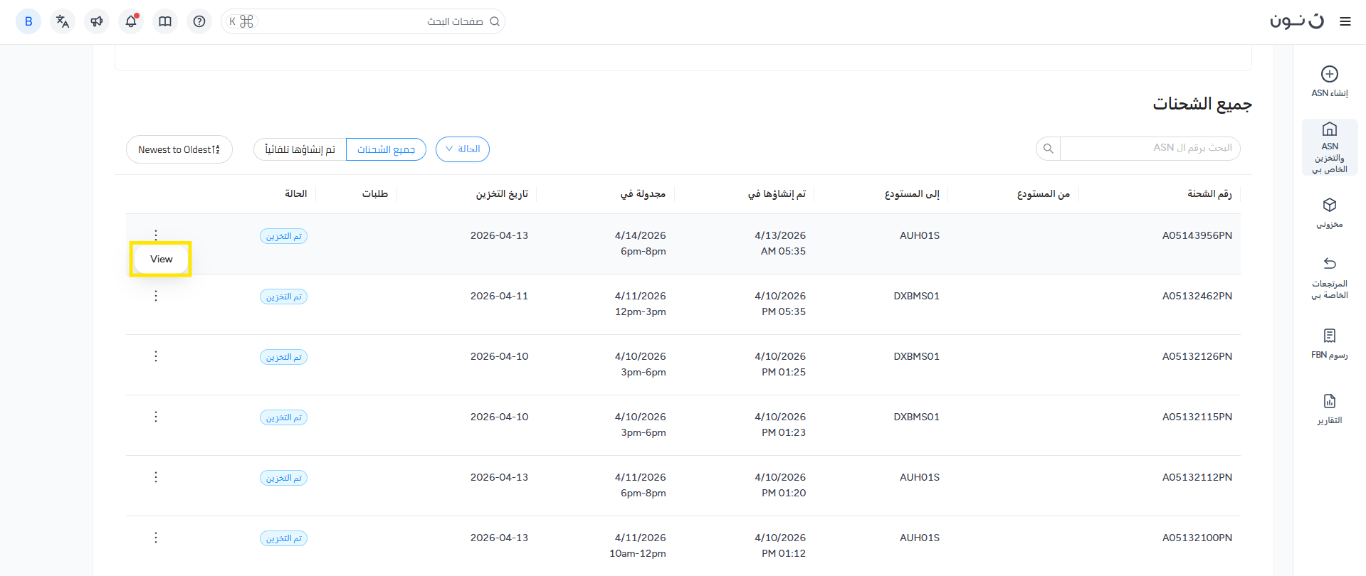 انقر على View للانتقال إلى صفحة تفاصيل بوليصة الشحن المتقدمة (ASN).