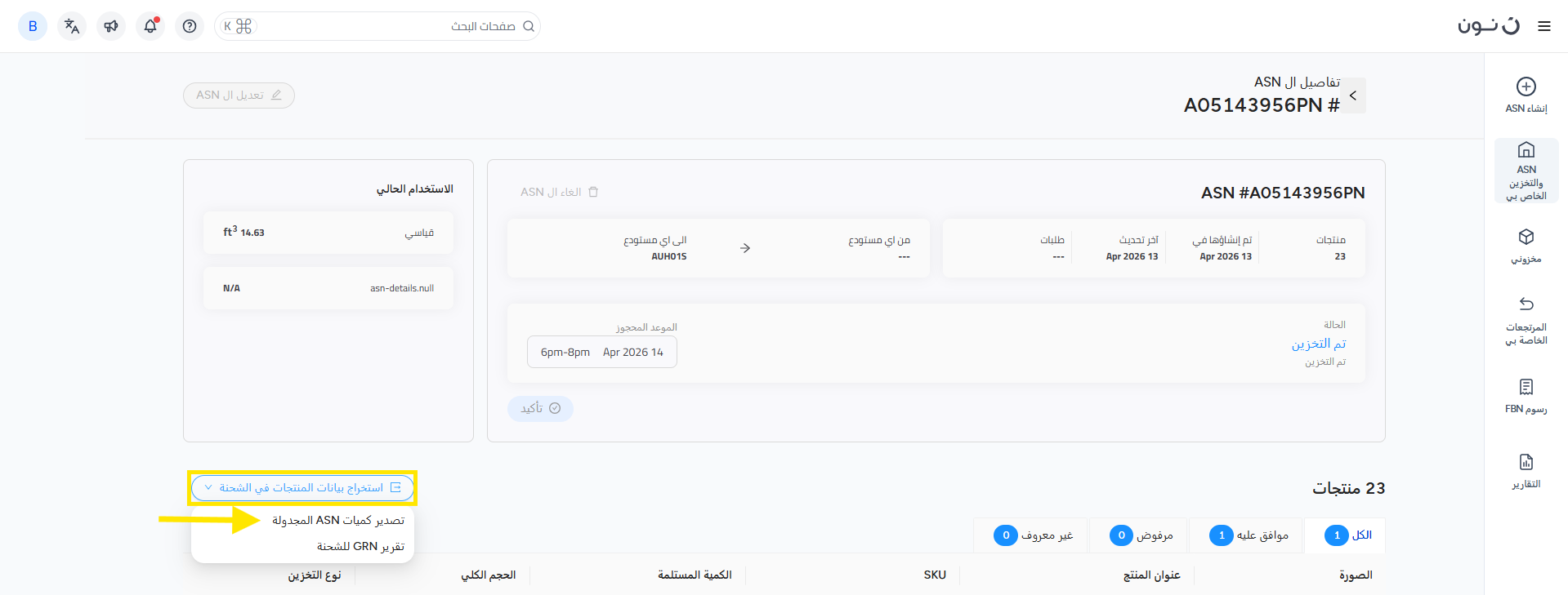 اختر "استخراج بيانات المنتجات في الشحنة"، ثم انقر على "تصدير كميات ASN المجدولة".