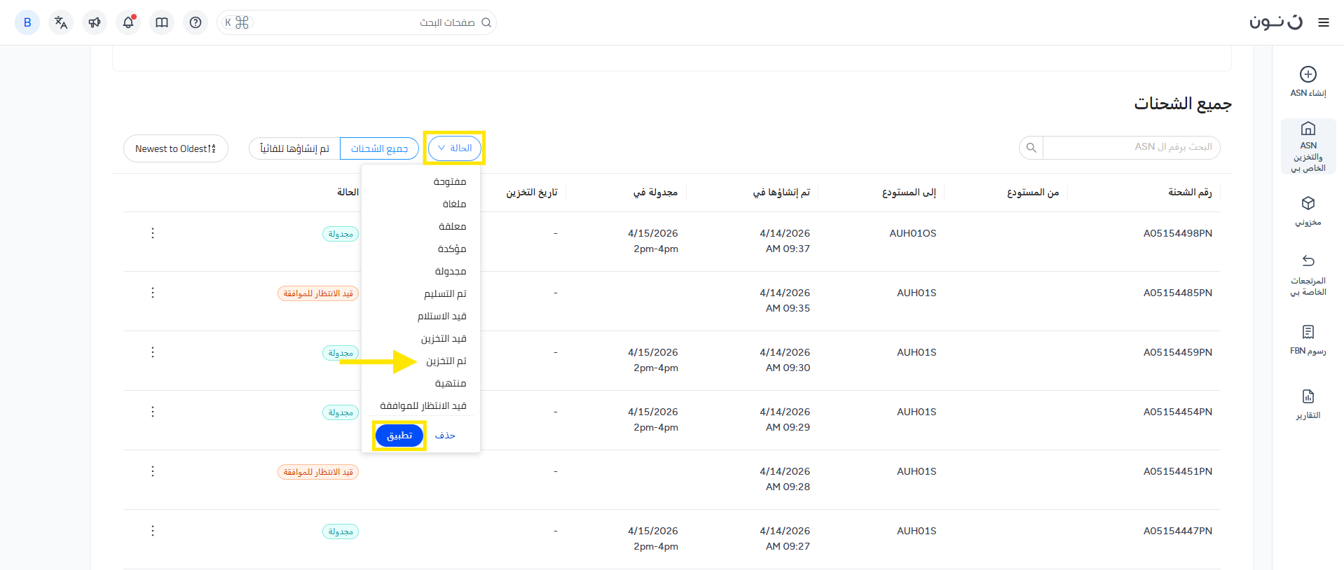 قم بتصفية أرقام الشحنات (ASNs) التي تحمل الحالة تم التخزين "GRN Completed".