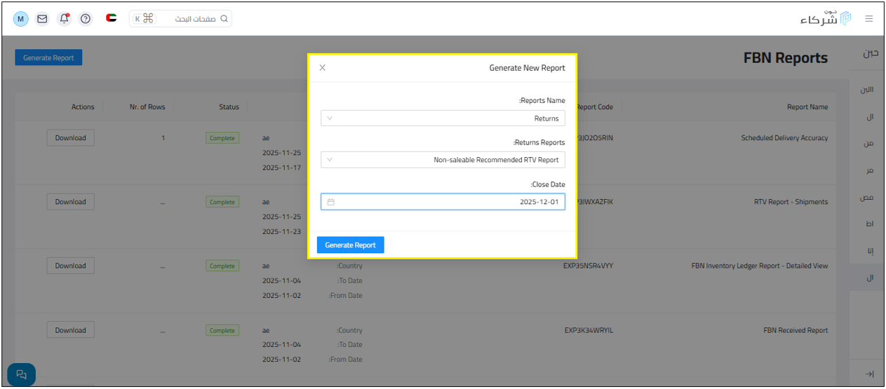 لمساعدتك على تجنب رسوم تخزين العناصر غير القابلة للبيع وإدارة مخزونك غير القابل للبيع بكفاءة، توفر نون تقرير المرتجعات الموصى بها للعناصر غير القابلة للبيع. يعرض هذا التقرير العناصر غير القابلة للبيع المخزنة في مراكز تنفيذ نون والتي تكون مؤهلة للاسترجاع أو الإزالة. يشرح هذا الدليل كيفية الوصول إلى التقرير ويوفر شرحاً تفصيلياً للأعمدة الموجودة في الملف.