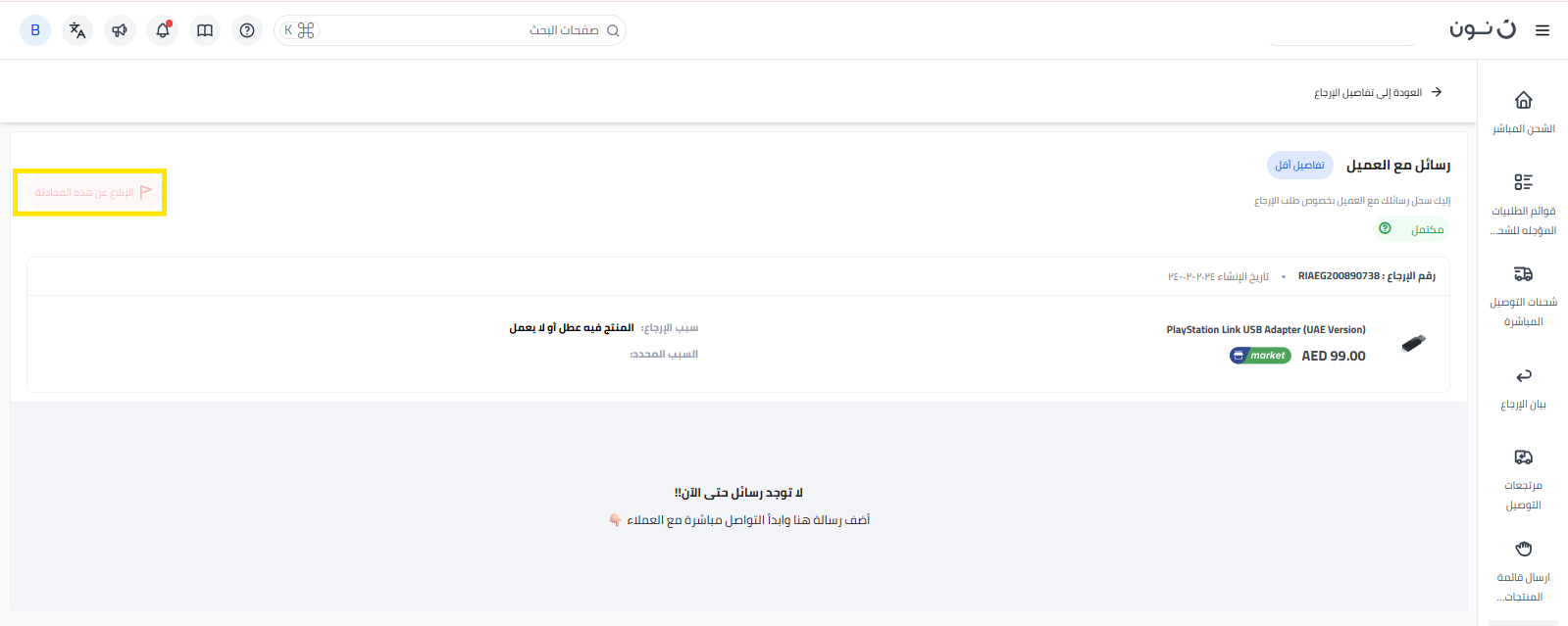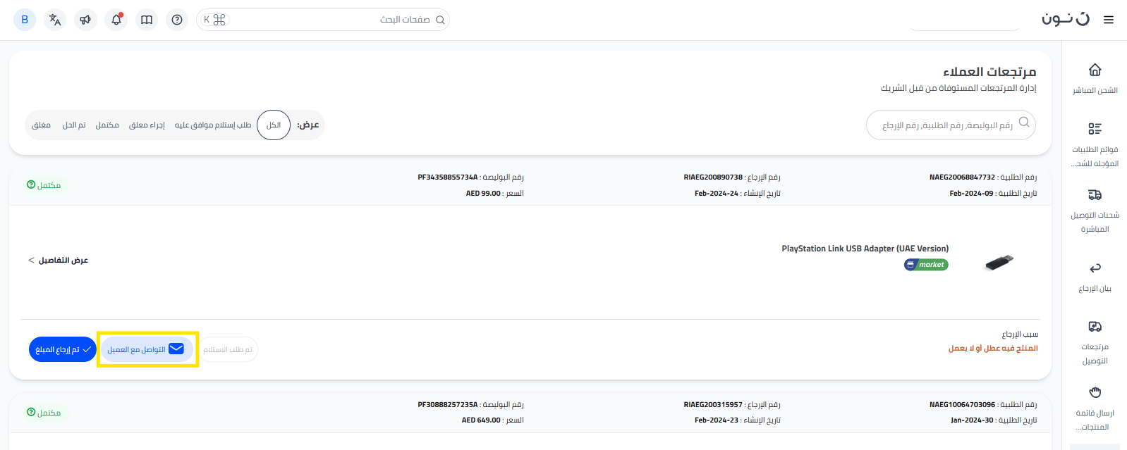 افتراضيًا، سترى رسائل تتطلب الرد عند الانتقال إلى صفحة إرجاع العملاء. سيكون لكل إرجاع زر "اتصل بالعميل" مع عدد الرسائل الجديدة.