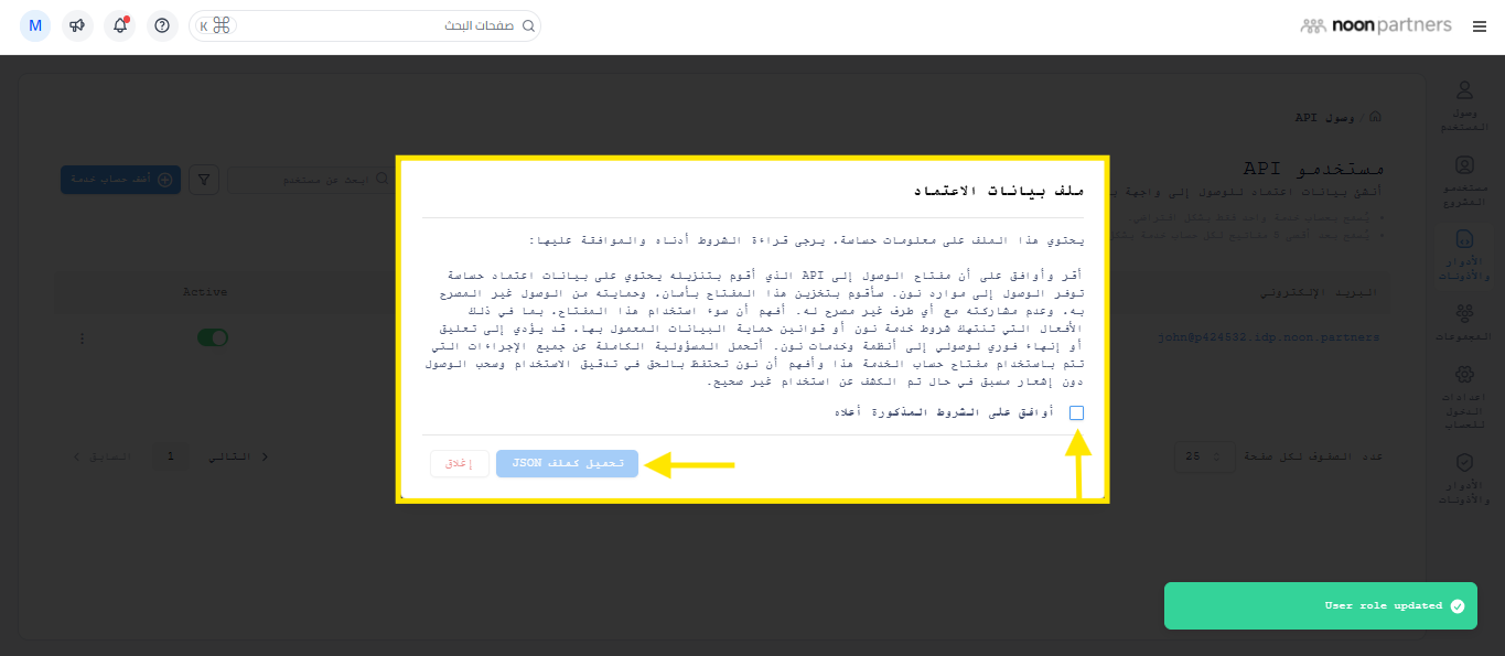 - ستظهر نافذة منبثقة تحتوي على بيانات الاعتماد الخاصة بك. وافق على الشروط ثم انقر على تحميل كملف JSON.