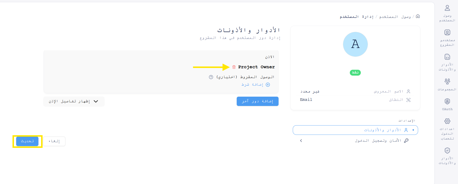 - الاذن يجب عليك اختيار مالك المشروع (Project Owner) لضمان أن عملية الربط تمتلك الأذونات الصحيحة.