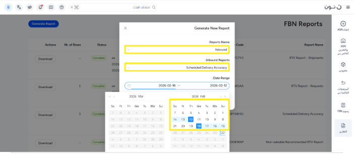 - في النافذة المنبثقة التي ستظهر، اختر اسم التقرير (Report Name) كـ Inbound، ثم اختر تقرير الوارد (Inbound Report) باسم Schedule Delivery Accuracy. بعد ذلك، حدّد النطاق الزمني الذي ترغب في استخراج البيانات له.