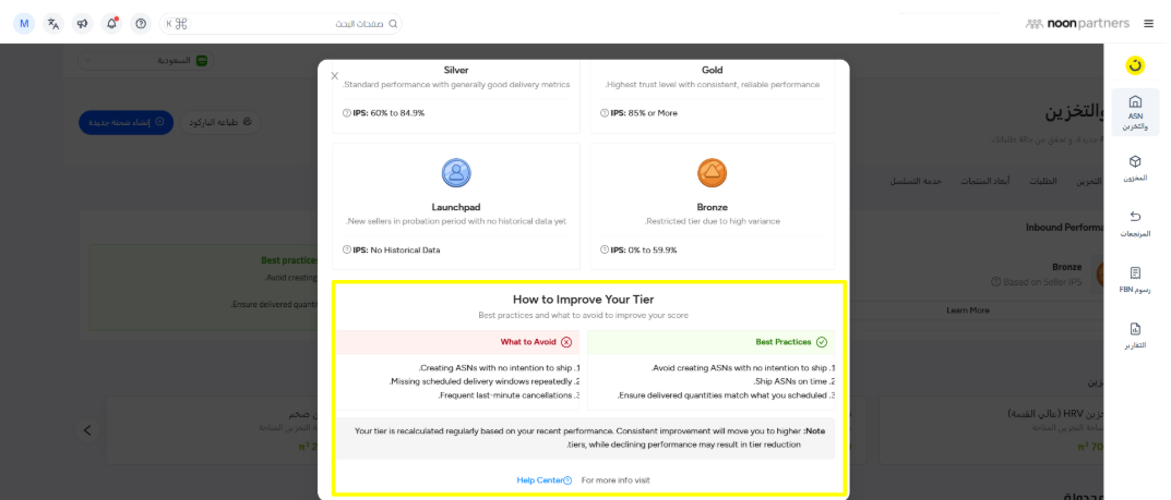 لضمان تجربة استلام سلسة وموثوقة لجميع الشركاء، تعتمد نون نظام تصنيف قائم على الأداء. يُصنِّف هذا النظام البائعين إلى مستويات وفقًا لمدى دقة التزامهم بتسليم المخزون المُجدول، ويؤثر مستوى أدائك بشكل مباشر على حدود سعة الاستلام المخصصة لك.
