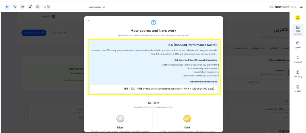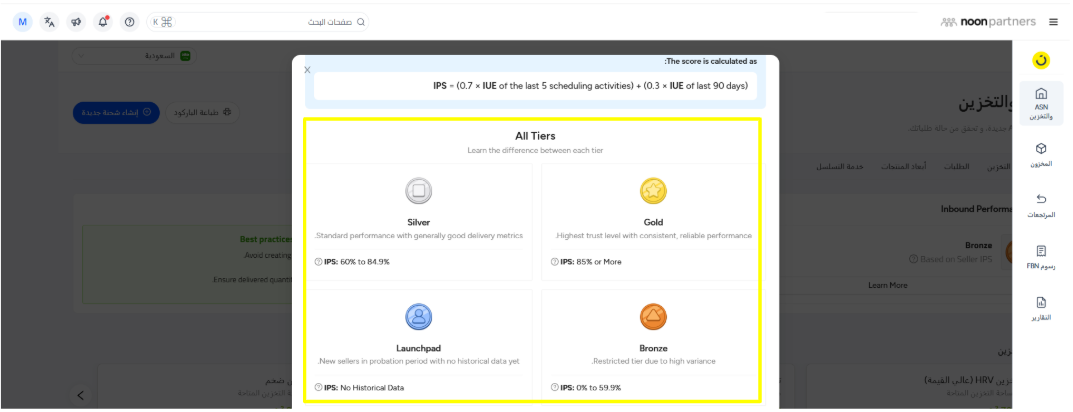 لضمان تجربة عادلة وفعّالة للجميع في مستودعاتنا، نقوم بتصنيف البائعين إلى مستويات بناءً على نقاط أداء الاستلام (IPS). تقيس هذه النقاط مدى تطابق الشحنات التي تقوم بتسليمها فعليًا مع بوليصة الشحن المتقدمة (ASN) التي قمت بجدولتها مسبقًا.وبناءً على نقاط أداء الاستلام، يتم تصنيف مستويات أداء البائعين إلى 4 فئات كما هو موضح في الجدول أدناه.
