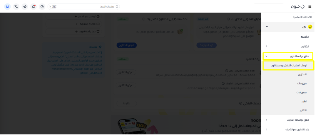 - سجّل الدخول إلى موقع البائع وانقر على قائمة التنقل. اختر حُقق بواسطة نون، ثم انقر على إرسال المنتجات لتحقق بواسطة نون.