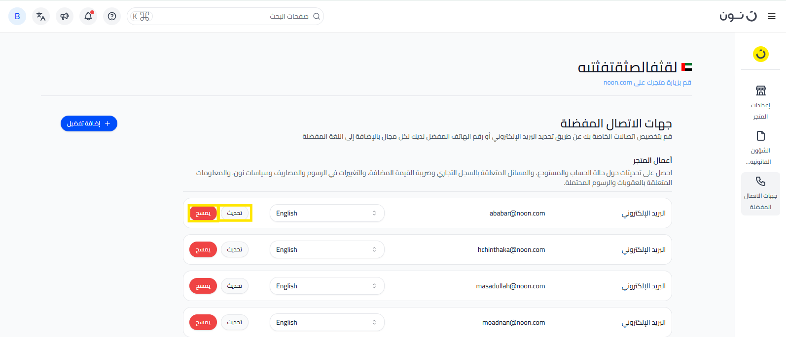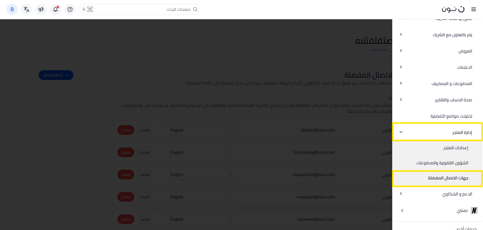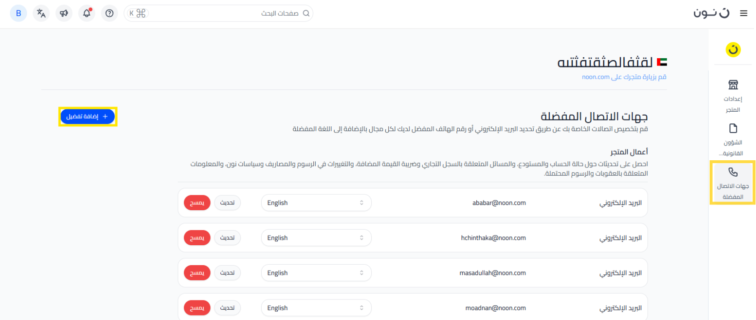 في شريط التنقل علي موقع البائعين، اضغط على إدارة المتجر ثم اضغط على جهات الاتصال المفضلة.