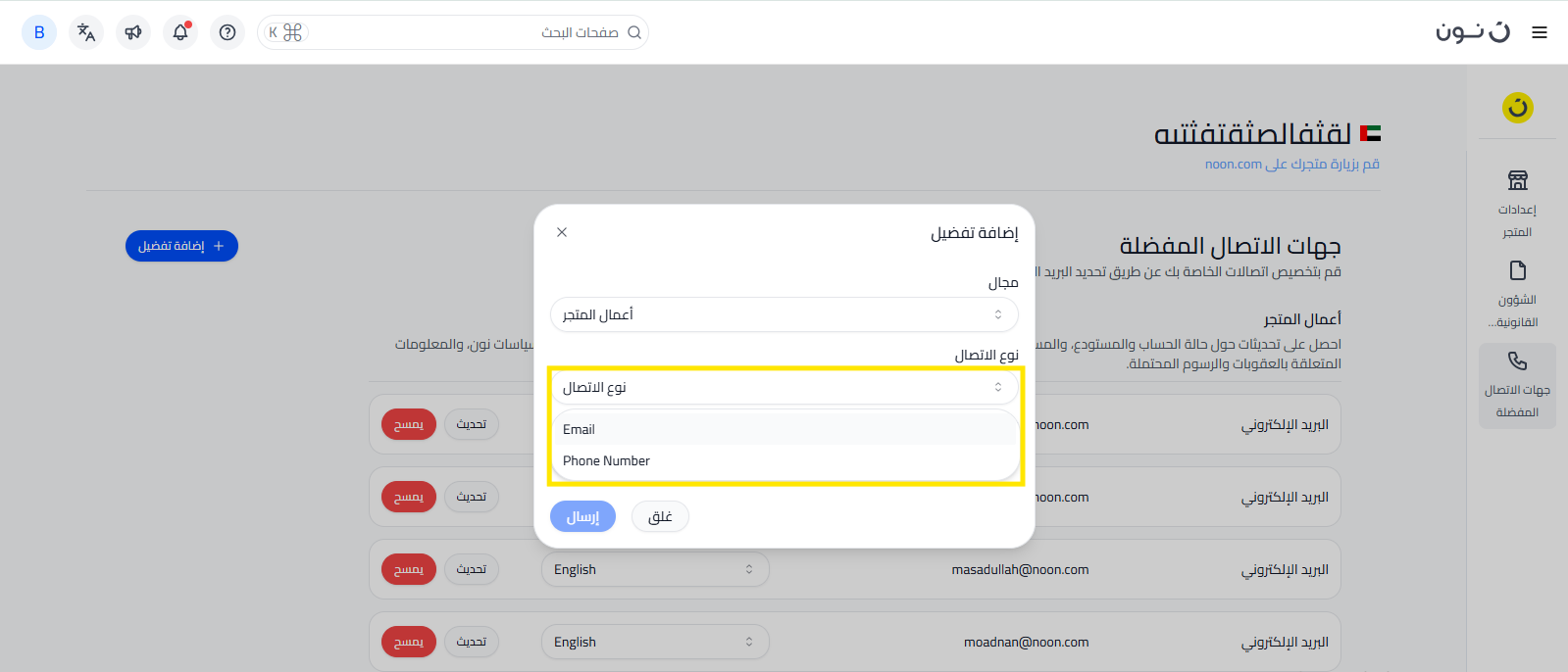- ثم قم باختيار نوع الاتصال (البريد الإلكتروني أو رقم الهاتف)، حيث يمكن للبائعين الآن إضافة ما يصل إلى رقمين هاتفيين لكل مجال ، ويمكن الوصول إلى هذه الخاصية فقط من قبل المستخدمين الإداريين.