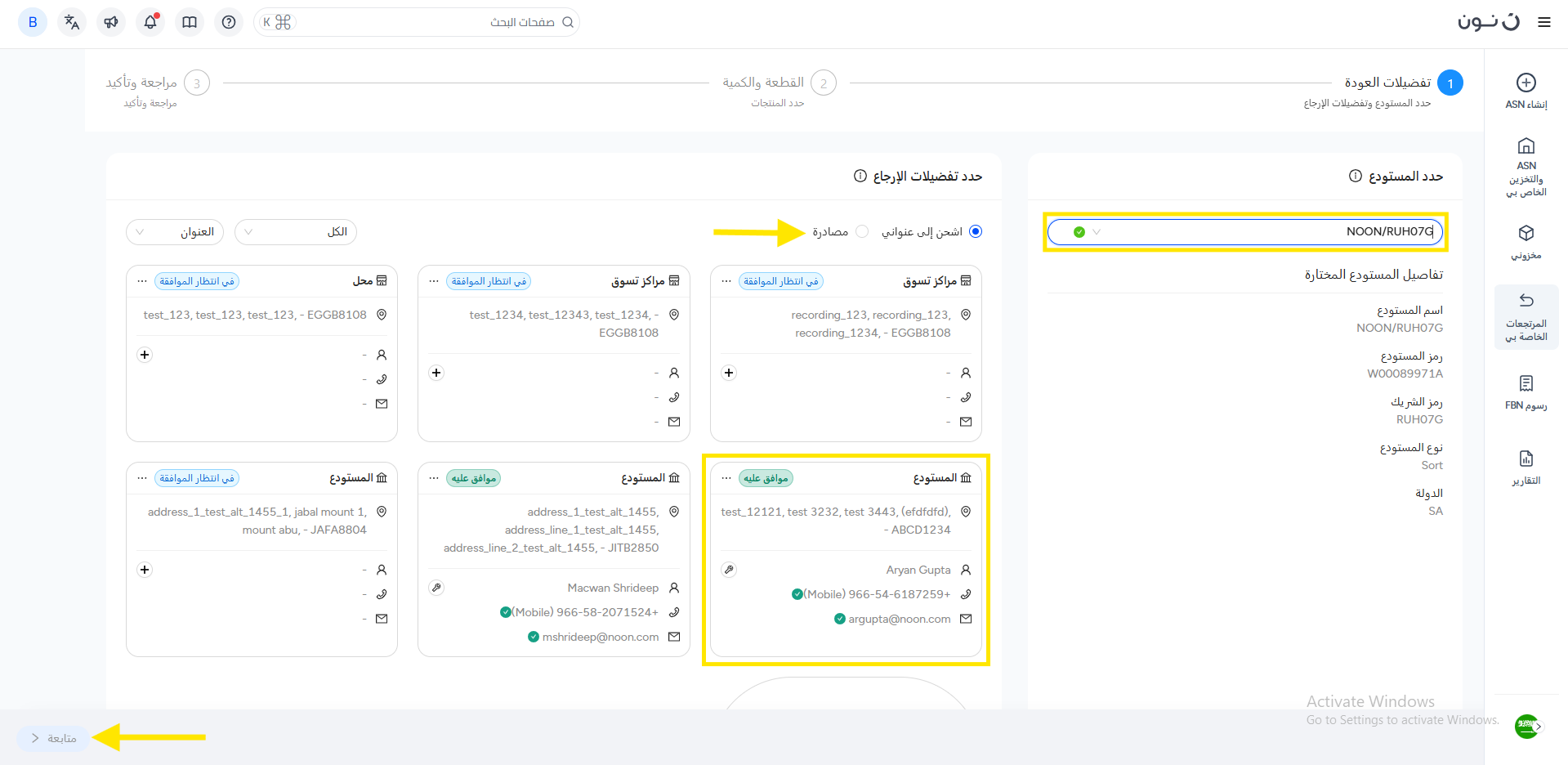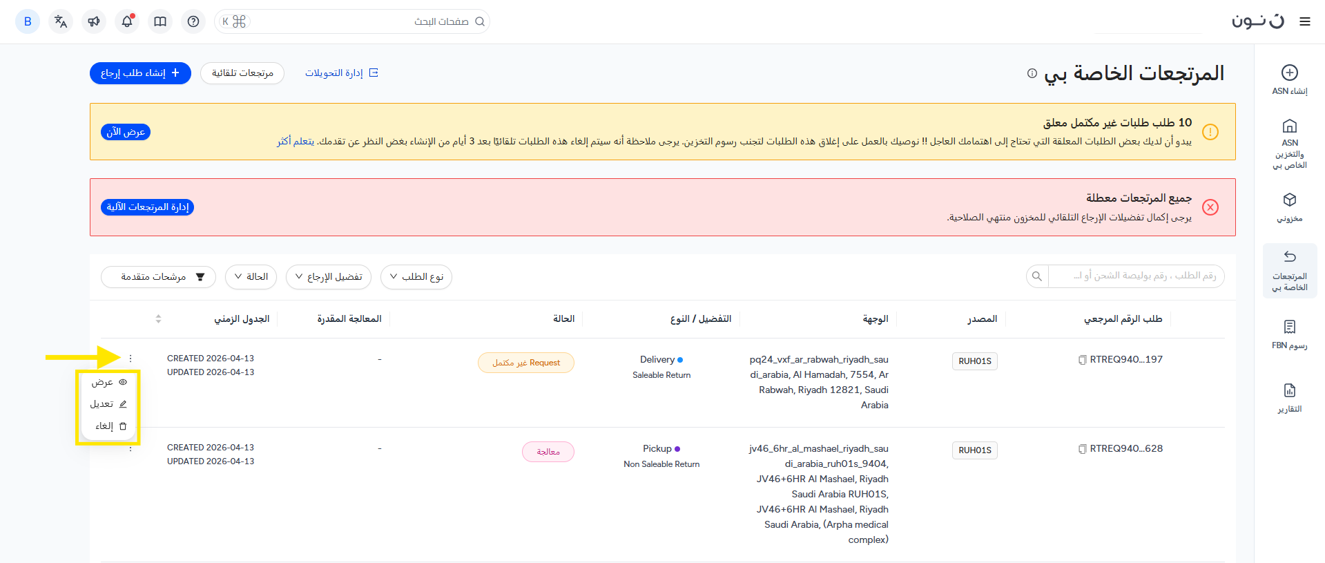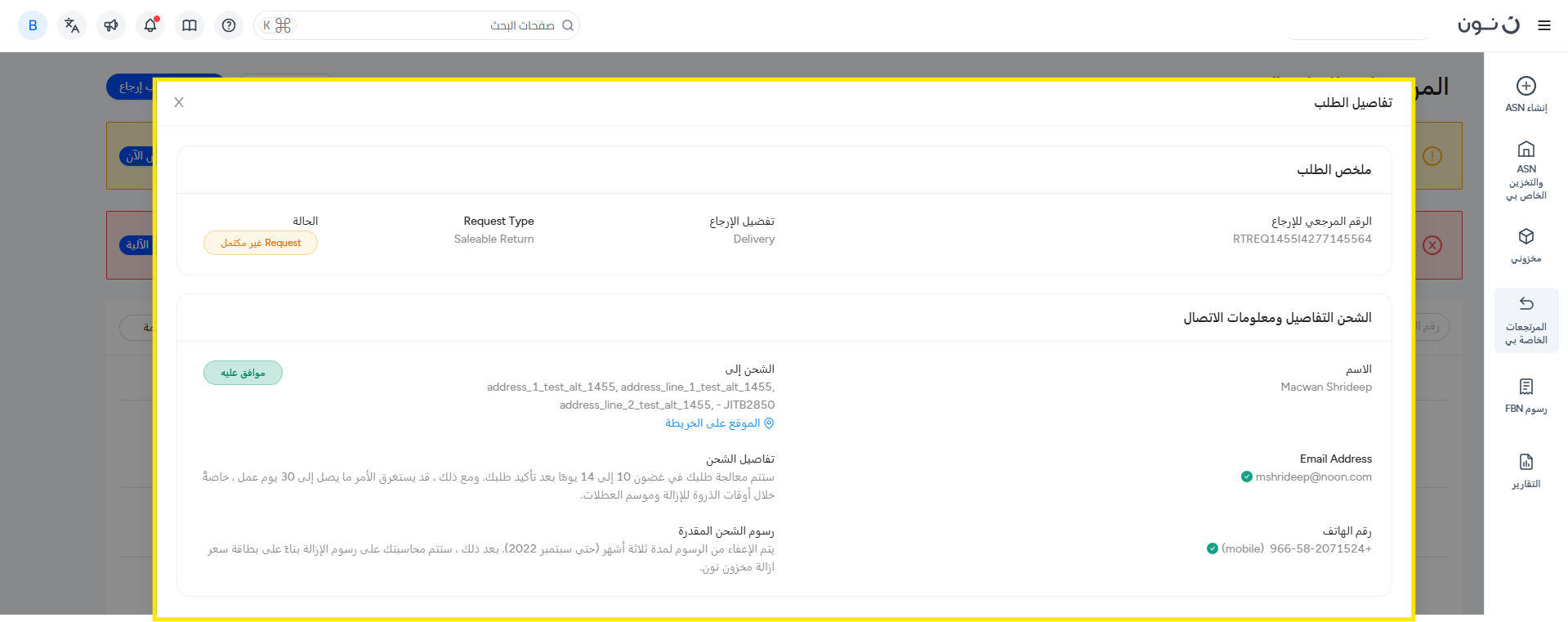 ملاحظة: بمجرد انتقال طلب الإرجاع إلى مرحلة الموافقة المعلقة، لا يمكن إلغاؤه.بالنسبة للعناصر المخزنة في مستودعات الدارك ستور أو المستودعات الضخمة، يجب على البائع إرسال بريد إلكتروني إلى seller@noon.com يتضمن التفاصيل التالية: