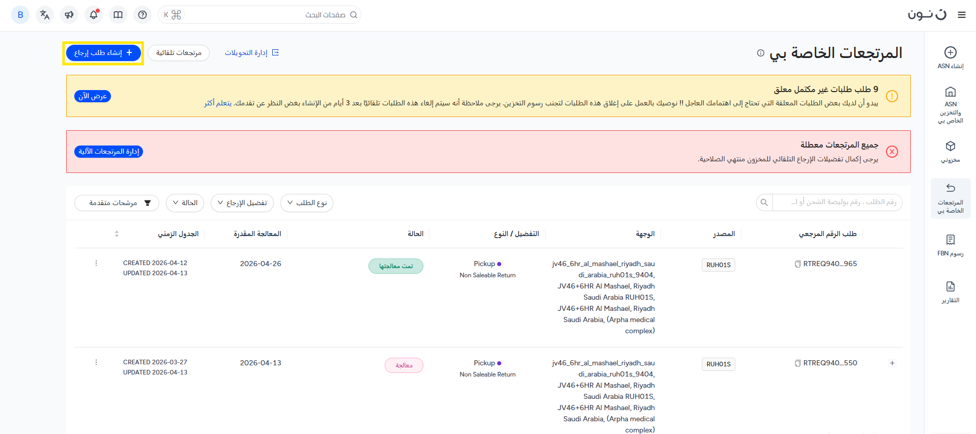 ملاحظة: إذا كنت بائعاً على نموذج الشحن المباشر، فسيتم إعادة المرتجعات غير المسلمة (NDRs) تلقائياً إلى عنوانك المسجل - و لا حاجة إلى طلب استرجاع.