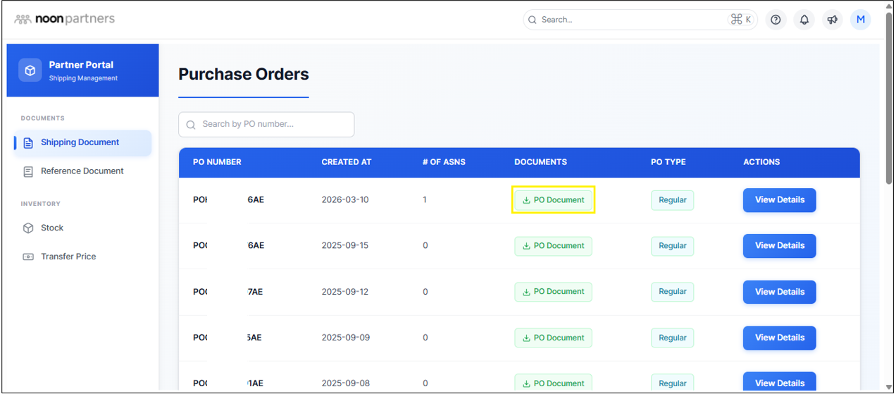 - انقر على مستند الشحن في القائمة الجانبية اليسرى. ثم انقر على عرض التفاصيل لأمر الشراء (PO) المطلوب.