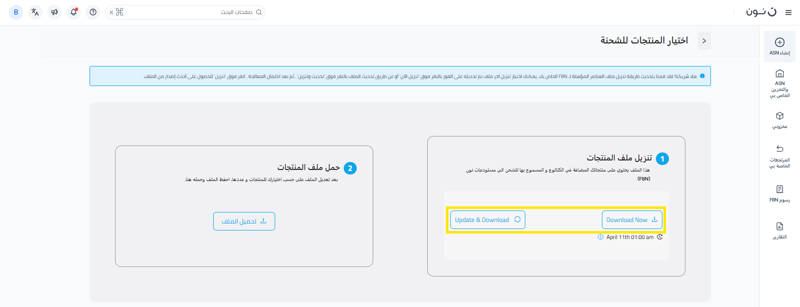 ملاحظة مهمة: استخدم هذا التقرير لإنشاء إشعارات الشحن المسبق FBN ASNs مباشرةً، والتي سيتم الموافقة عليها فوراً لتسريع عملية إعادة التخزين.