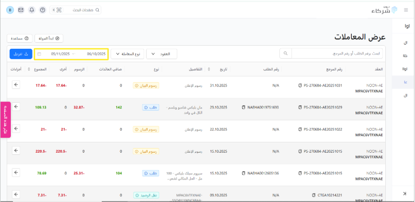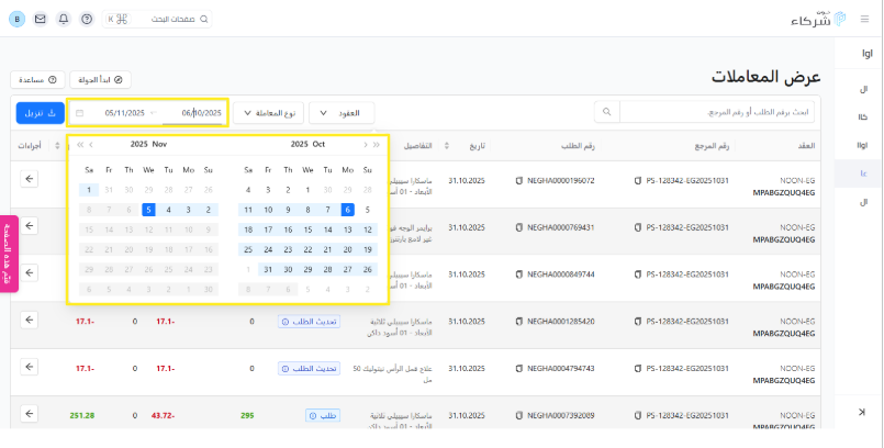 - في صفحة عرض المعاملات، حدد نطاق التاريخ الذي تريد استخراج بياناته.