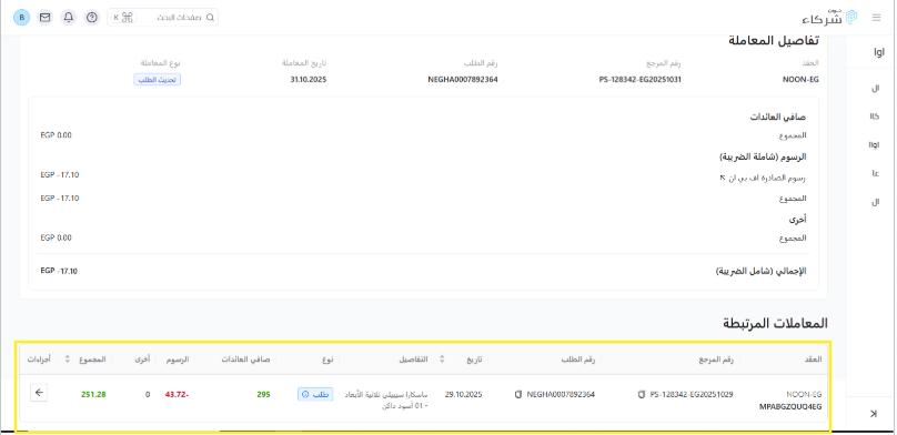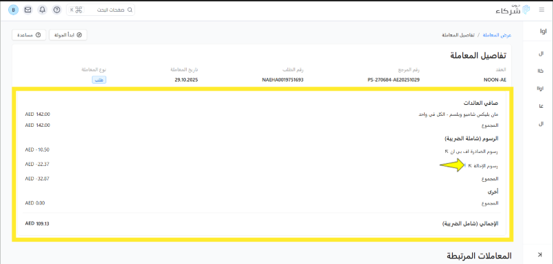 -إذا مررت للأسفل في الصفحة، ستجد قسمًا بعنوان "المعاملات المرتبطة". يعرض هذا القسم جميع المعاملات التي تمت للطلب نفسه، بما في ذلك أي رسوم إضافية أو مرتجعات من العميل.