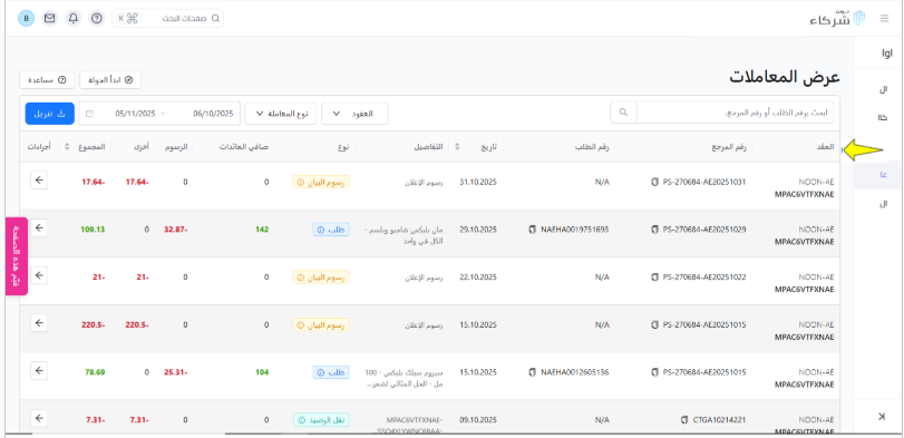 عند النقر على زر "السهم"، سيتم تحويلك إلى صفحة تفاصيل المعاملة. ستجد في الأعلى تفاصيل مثل رقم المرجع، والعقد، ونوع المعاملة، وتاريخ المعاملة، ورقم الطلب.