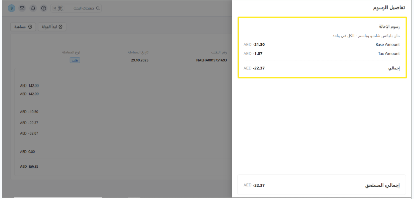 -يُقدم قسم "صافي الإيرادات والرسوم" تفصيلاً للرسوم المُفروضة. يُمكنك النقر على اسم الرسوم أو السهم لمزيد من المعلومات.