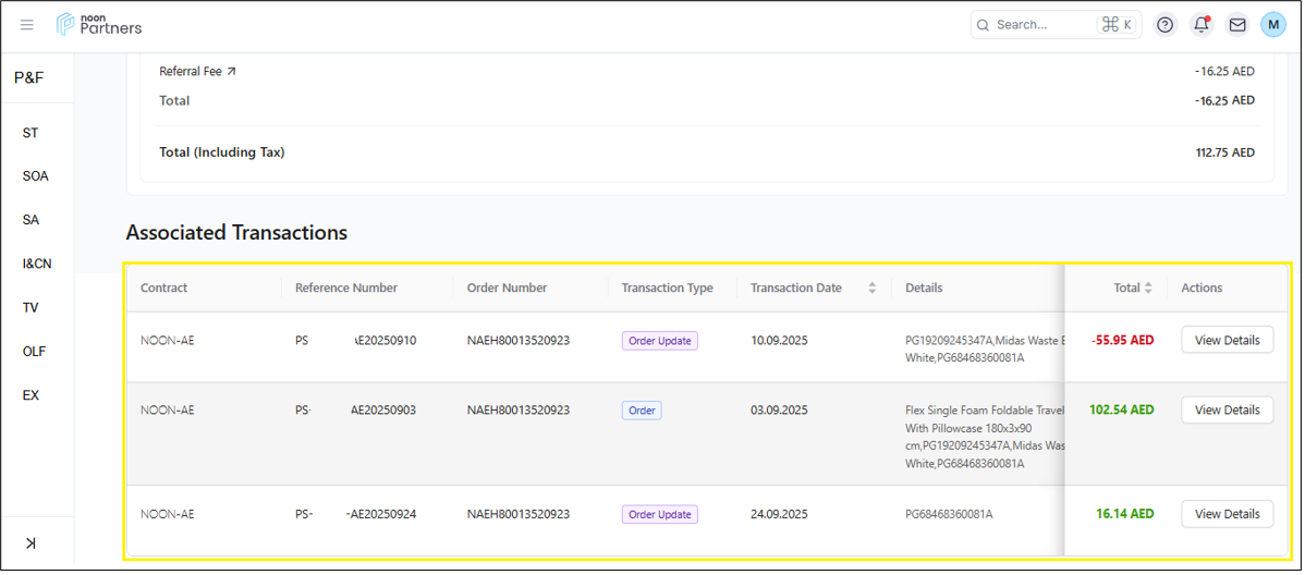 -إذا مررت للأسفل في الصفحة، ستجد قسمًا بعنوان "المعاملات المرتبطة". يعرض هذا القسم جميع المعاملات التي تمت للطلب نفسه، بما في ذلك أي رسوم إضافية أو مرتجعات من العميل.