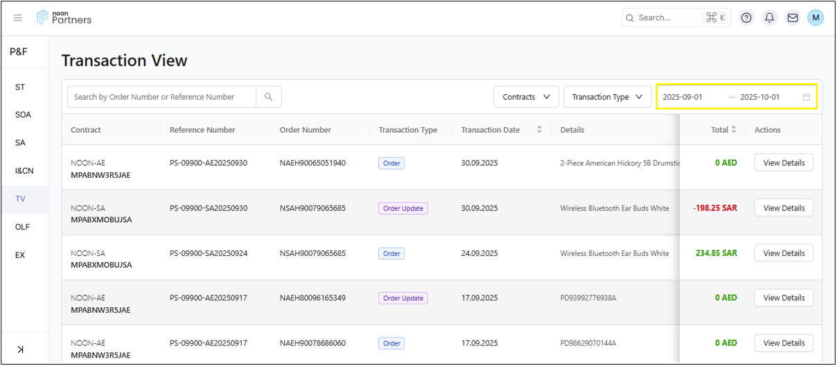في صفحة عرض المعاملة، ستلاحظ بعض خيارات التصفية والبحث لتحسين نتائج البحث الخاصة بك.