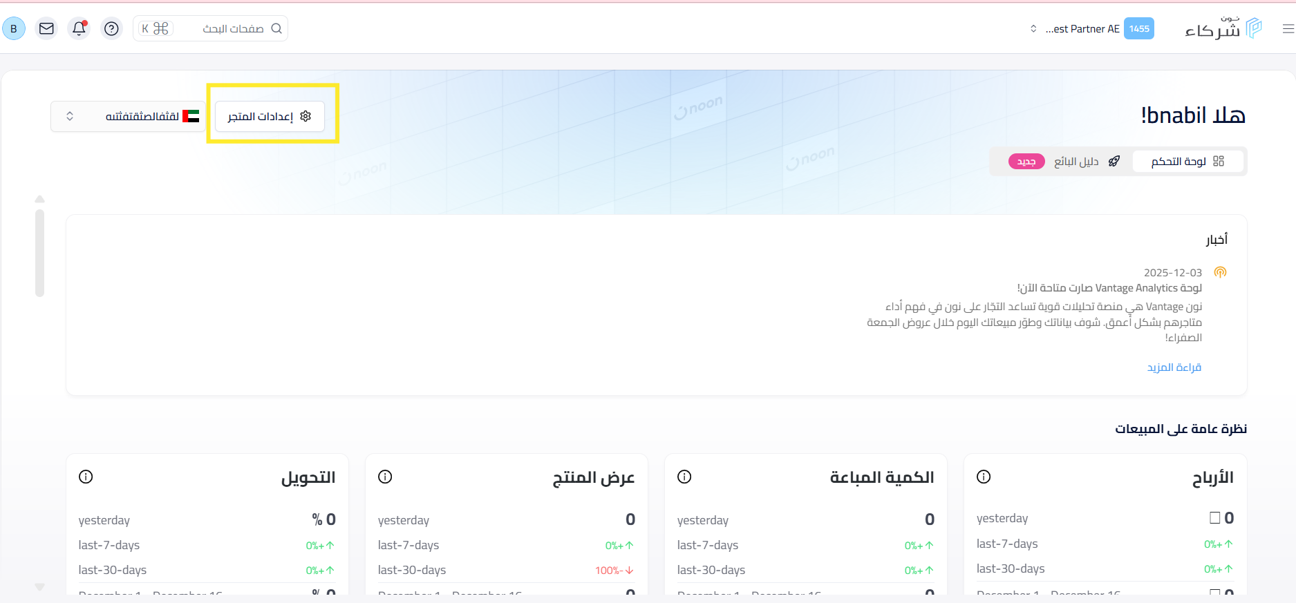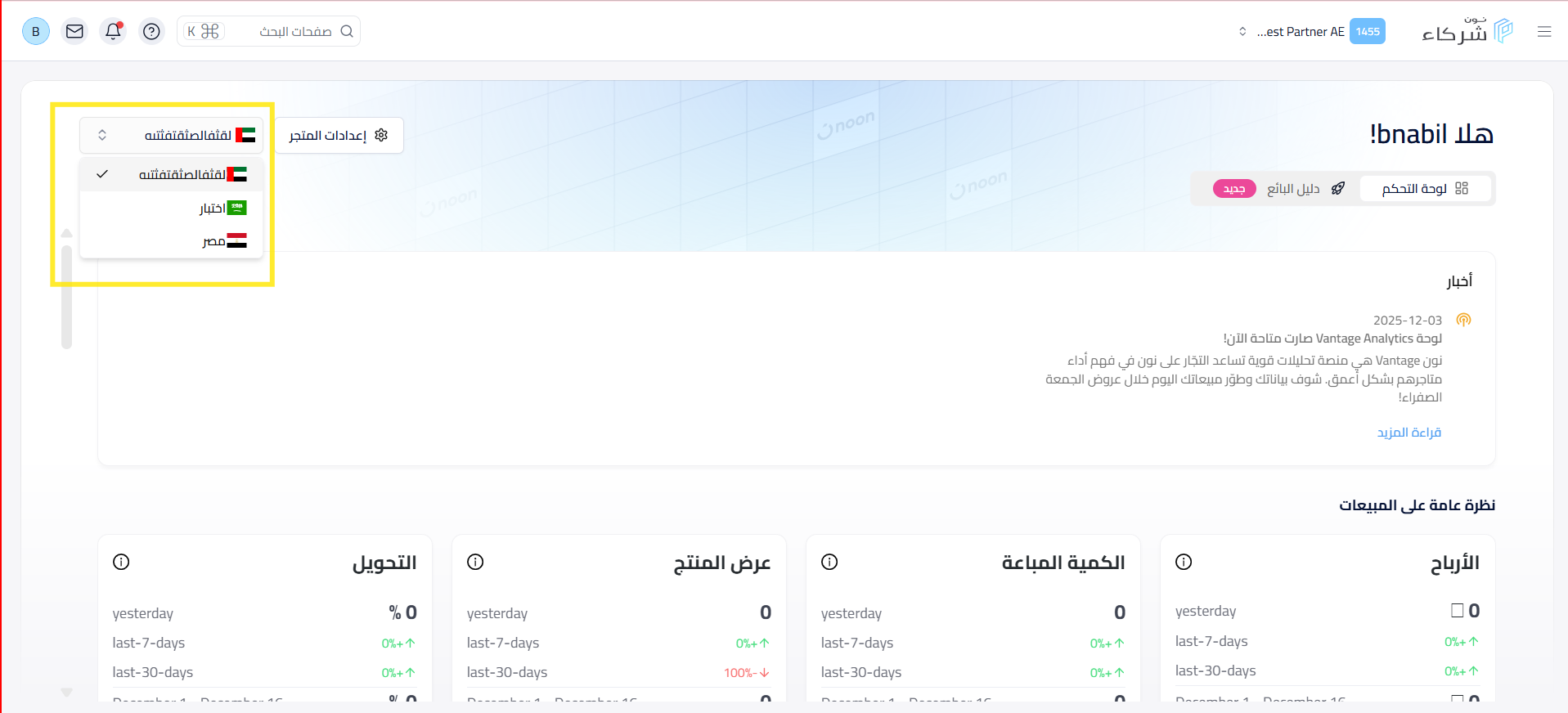 - في الصفحة الرئيسية لـ منصة شركاء نون، يجب اختيار المتجر الذي تقوم بإعداد ملف الفوترة له، سواء كان الإمارات أو السعودية أو مصر.