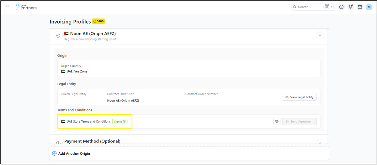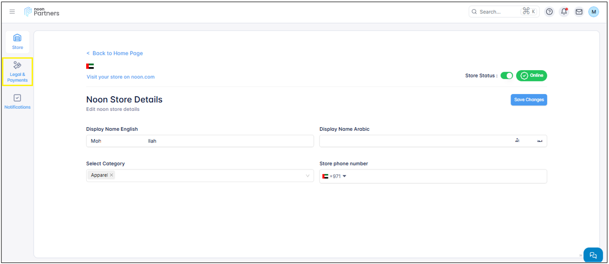 - في صفحة تفاصيل متجر نون، انقر على خيار الشؤون القانونية والمدفوعات.