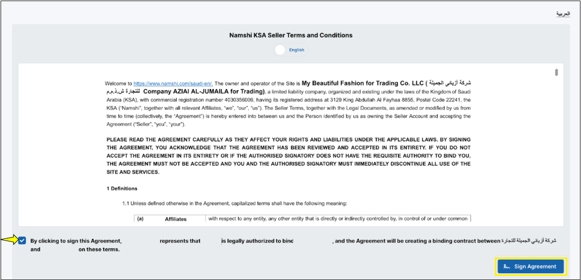 -بمجرد تفعيل الشروط والأحكام، سيتم إرسال بريد إلكتروني إلى البريد الإلكتروني المرتبط بالموقّع المُصرّح له، ويمكنك قراءة الشروط والأحكام بعناية. بعد ذلك، حدد خانة اختيار إخلاء المسؤولية وانقر على "توقيع الاتفاقية".