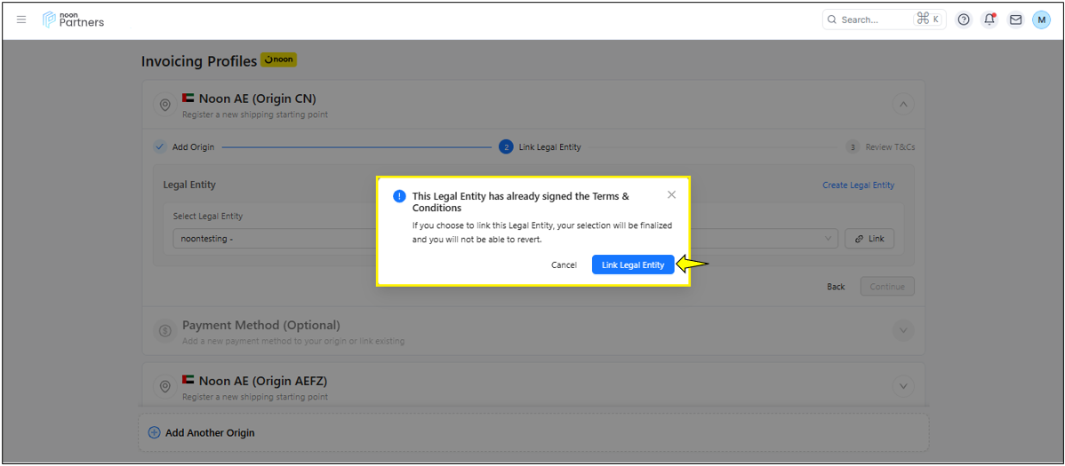 - إذا تمت الموافقة على الكيان القانوني وقمت بتوقيع العقد، فسترى نافذة منبثقة تقول أن العقد تم توقيعه بالفعل وكل ما عليك فعله هو النقر فوق زر ربط الكيان القانوني لإكمال العملية.