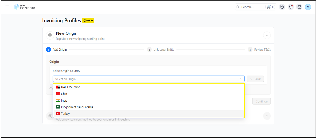 - بعد النقر على "إنشاء بلد المنشأ" في الخطوة السابقة، ستحتاج إلى تحديد بلد المنشأ من القائمة المنسدلة. بعد ذلك، انقر على "حفظ".