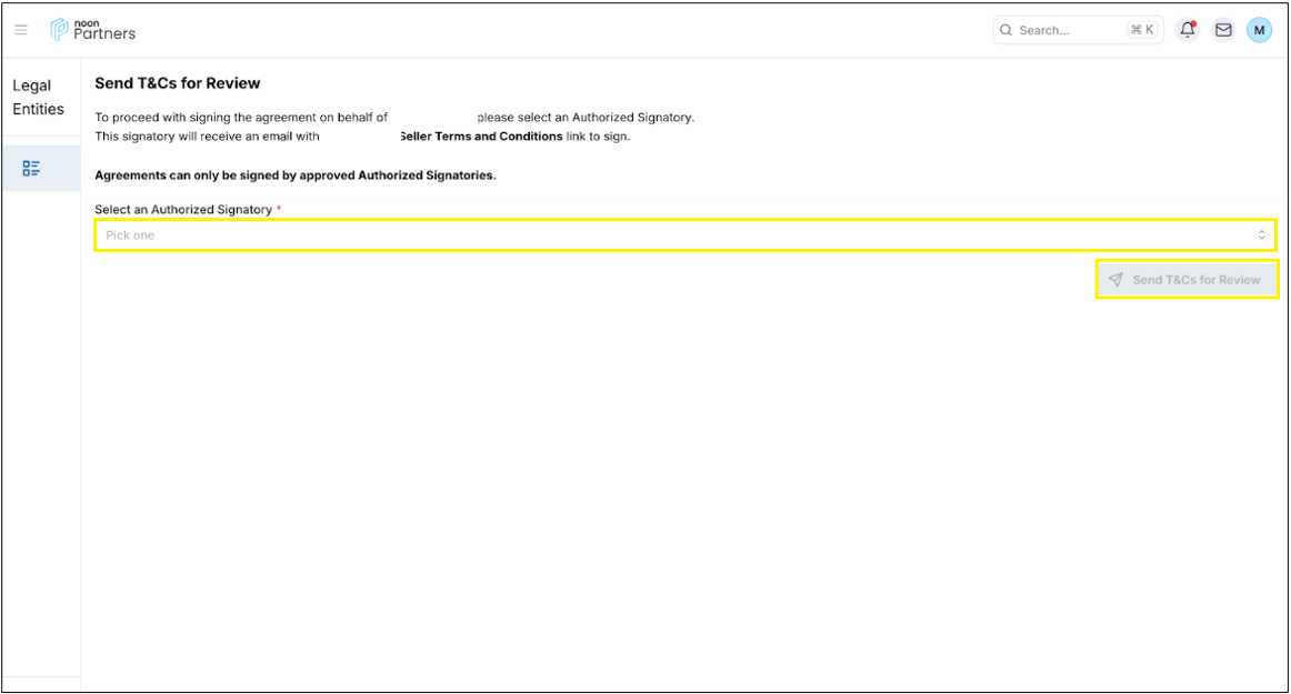-سيتم توجيهك لاختيار المُوَقِّع المُفَوَّض الذي سيُوَقِّع عقد المتجر. يمكنك اختيار المُوَقِّع من القائمة المنسدلة، ثم النقر على "إرسال الشروط والأحكام للمراجعة".