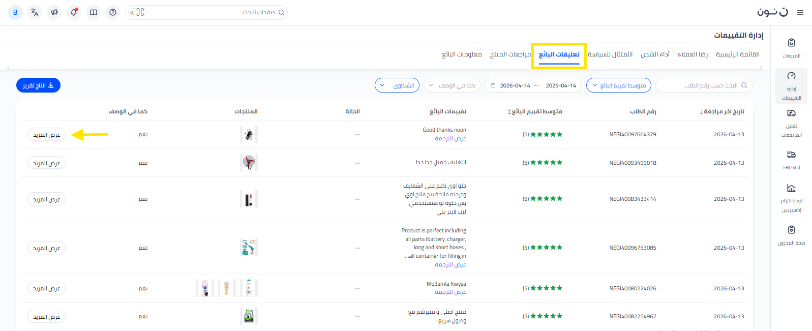 الخطوة 2: انقر على تبويب تعليقات البائع، وسيتم عرض جميع تقييمات العملاء لحسابك. ثم انقر على زر عرض المزيد الموجود بجانب التقييم.